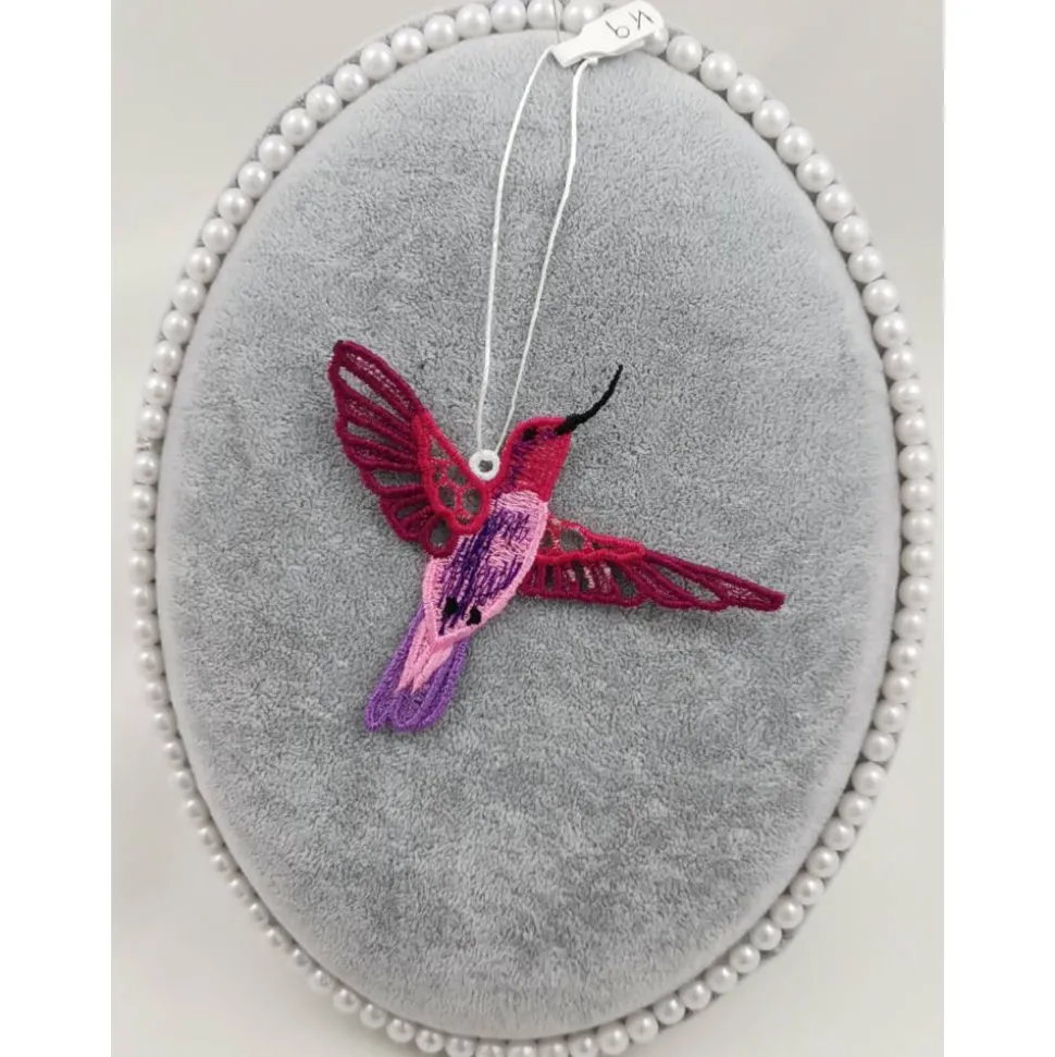 Lace Produkte werden mit einer Stickmaschine und Stickgarn auf wasserlöslichem Vlies gestickt. Nach dem Stickvorgang wird das Vlies ausgewaschen, sodass letztendlich nur die Stickerei übrig bleibt.