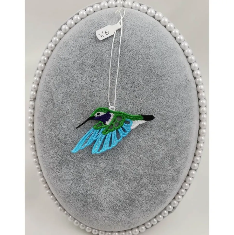 Lace Produkte werden mit einer Stickmaschine und Stickgarn auf wasserlöslichem Vlies gestickt. Nach dem Stickvorgang wird das Vlies ausgewaschen, sodass letztendlich nur die Stickerei übrig bleibt.