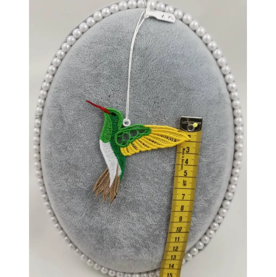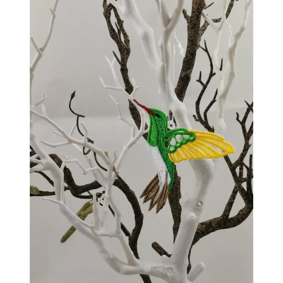 Lace Produkte werden mit einer Stickmaschine und Stickgarn auf wasserlöslichem Vlies gestickt. Nach dem Stickvorgang wird das Vlies ausgewaschen, sodass letztendlich nur die Stickerei übrig bleibt.