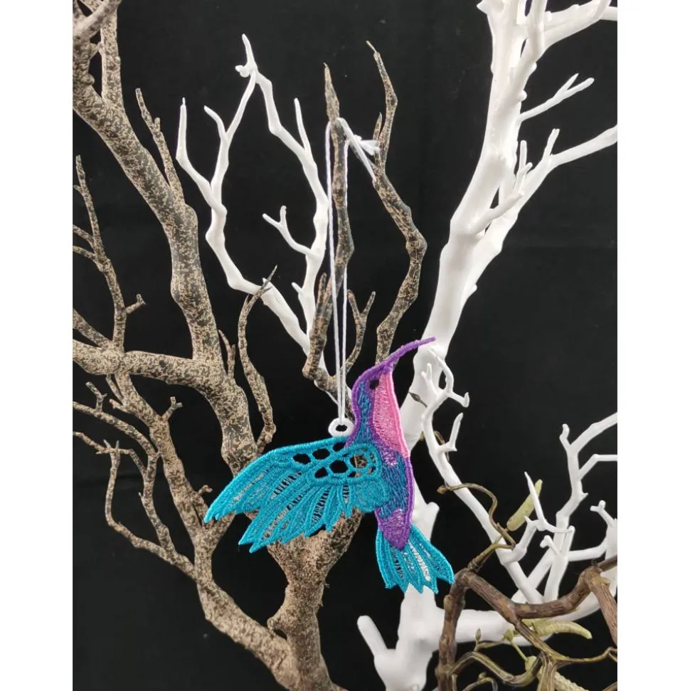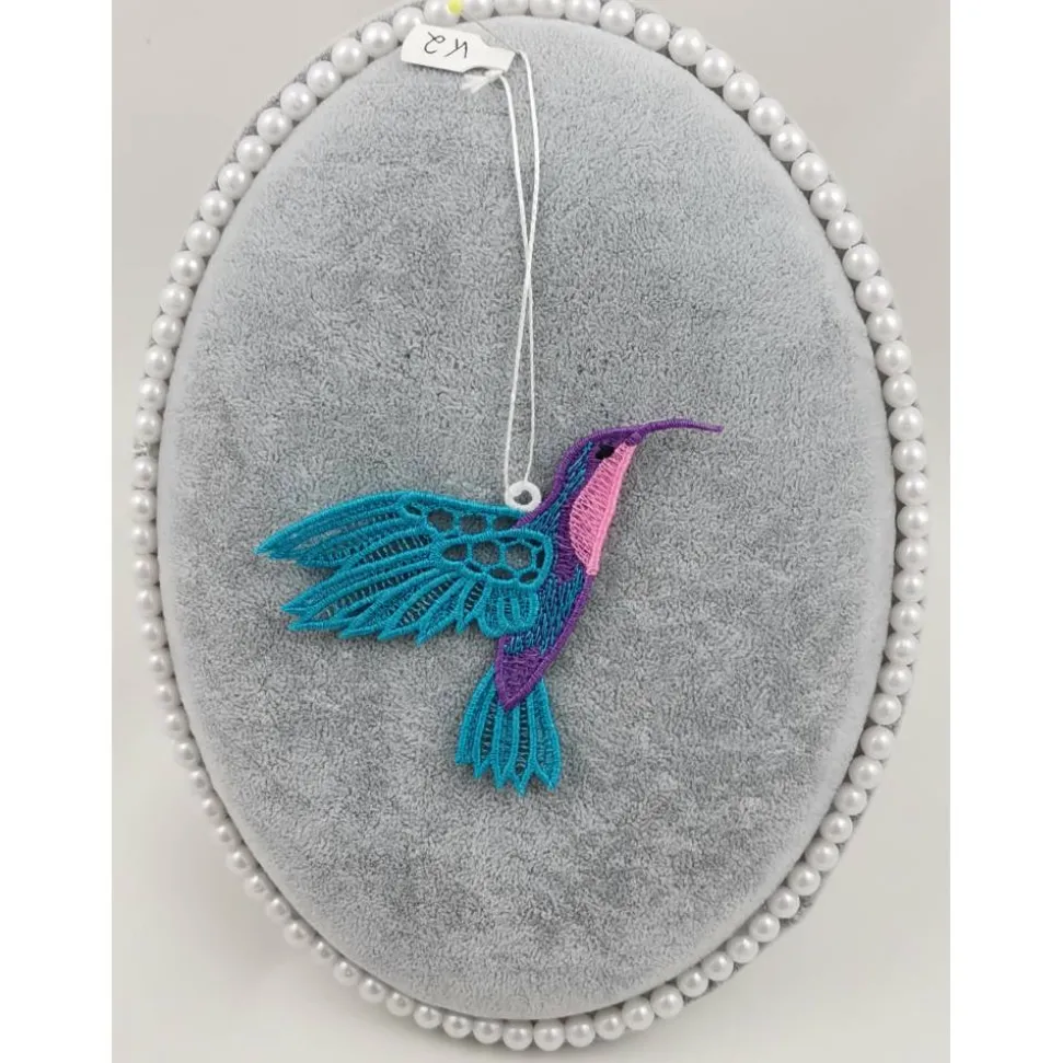 Lace Produkte werden mit einer Stickmaschine und Stickgarn auf wasserlöslichem Vlies gestickt. Nach dem Stickvorgang wird das Vlies ausgewaschen, sodass letztendlich nur die Stickerei übrig bleibt.