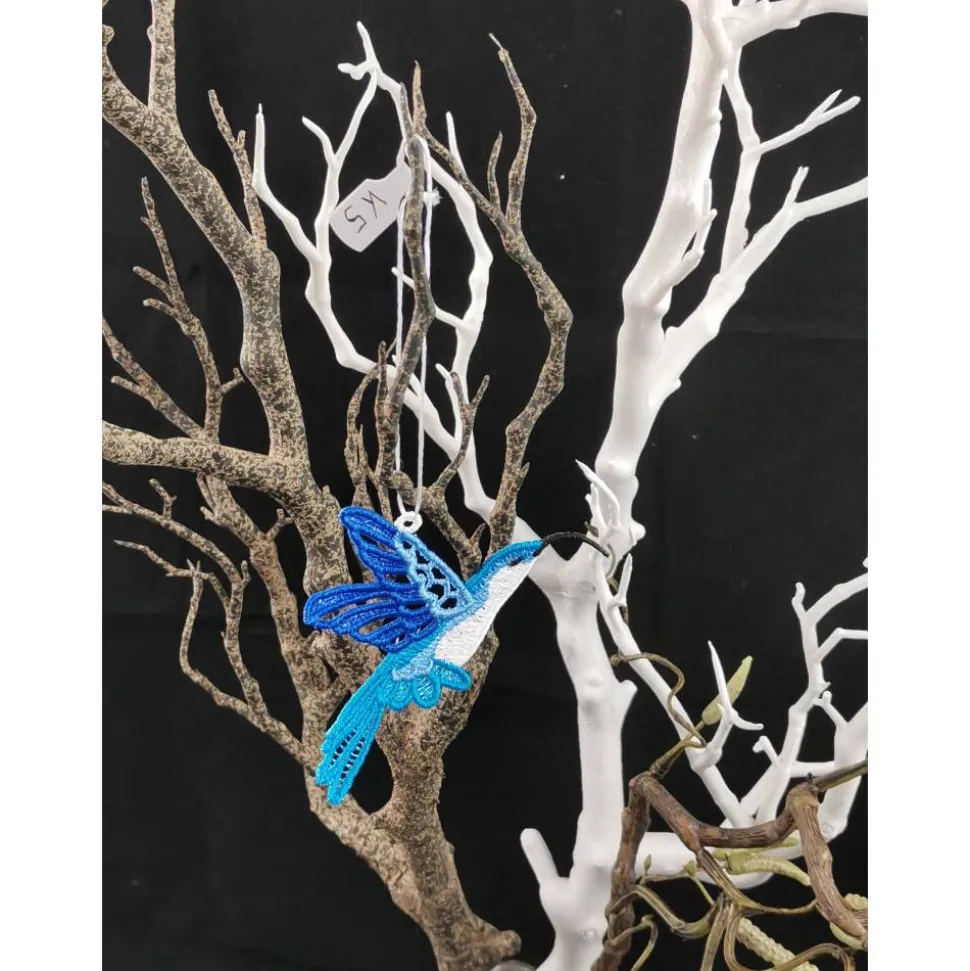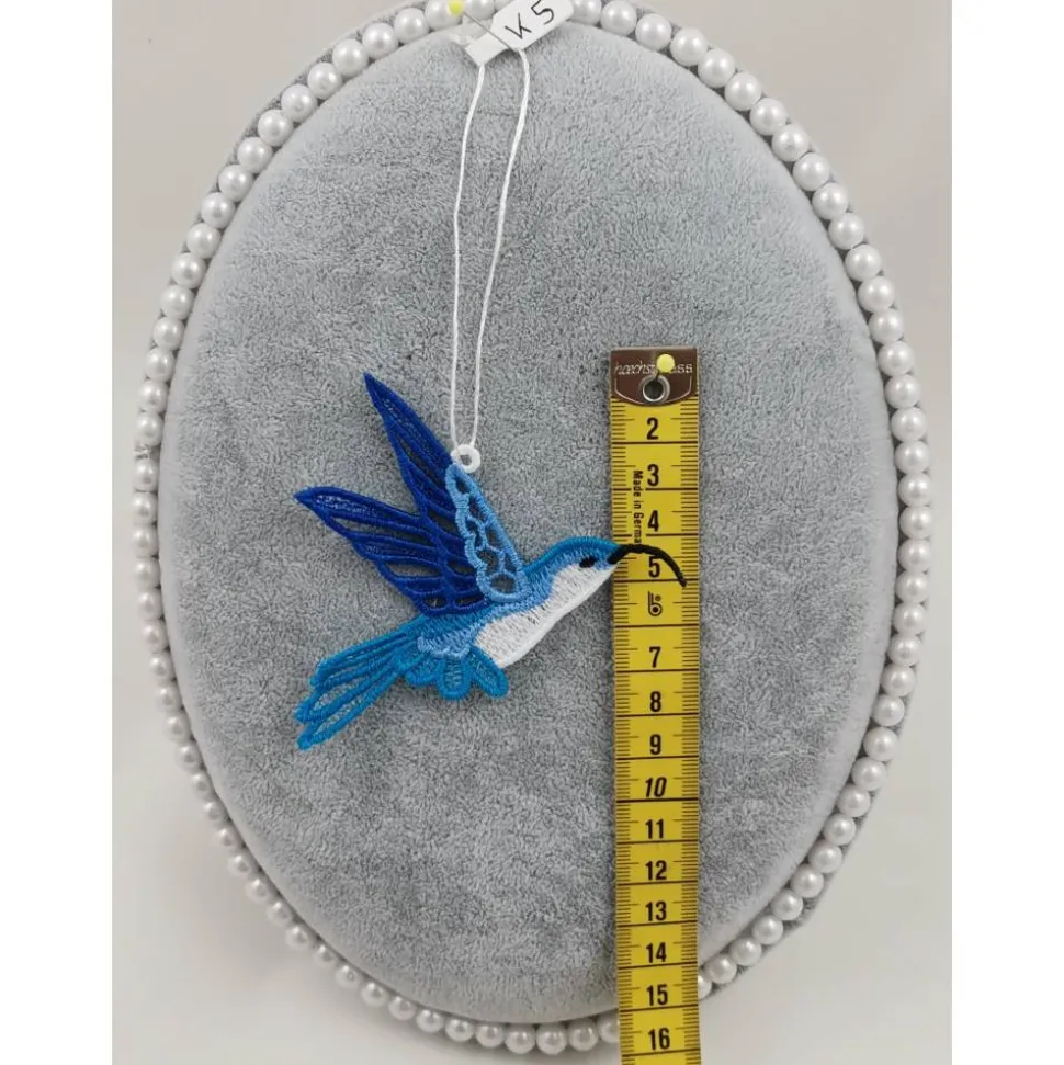 Lace Produkte werden mit einer Stickmaschine und Stickgarn auf wasserlöslichem Vlies gestickt. Nach dem Stickvorgang wird das Vlies ausgewaschen, sodass letztendlich nur die Stickerei übrig bleibt.