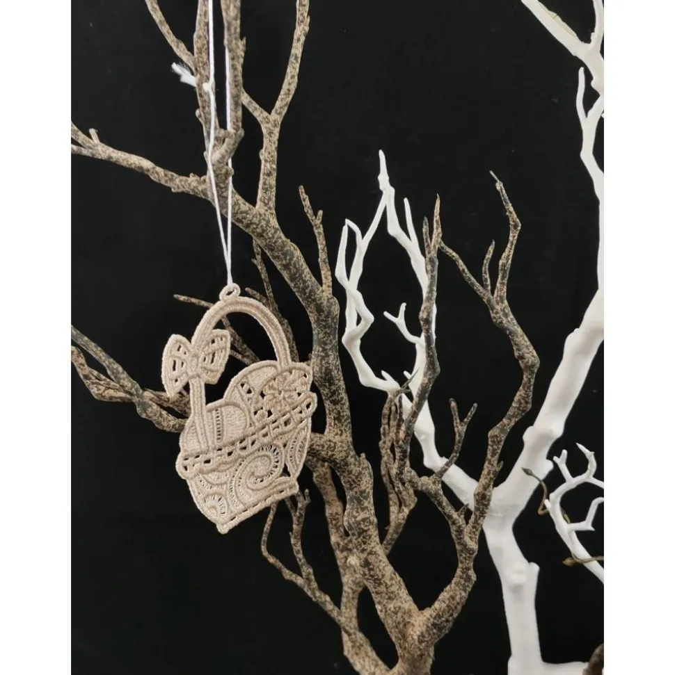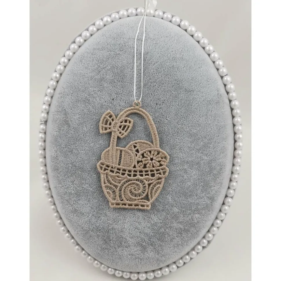 Lace Produkte werden mit einer Stickmaschine und Stickgarn auf wasserlöslichem Vlies gestickt. Nach dem Stickvorgang wird das Vlies ausgewaschen, sodass letztendlich nur die Stickerei übrig bleibt.