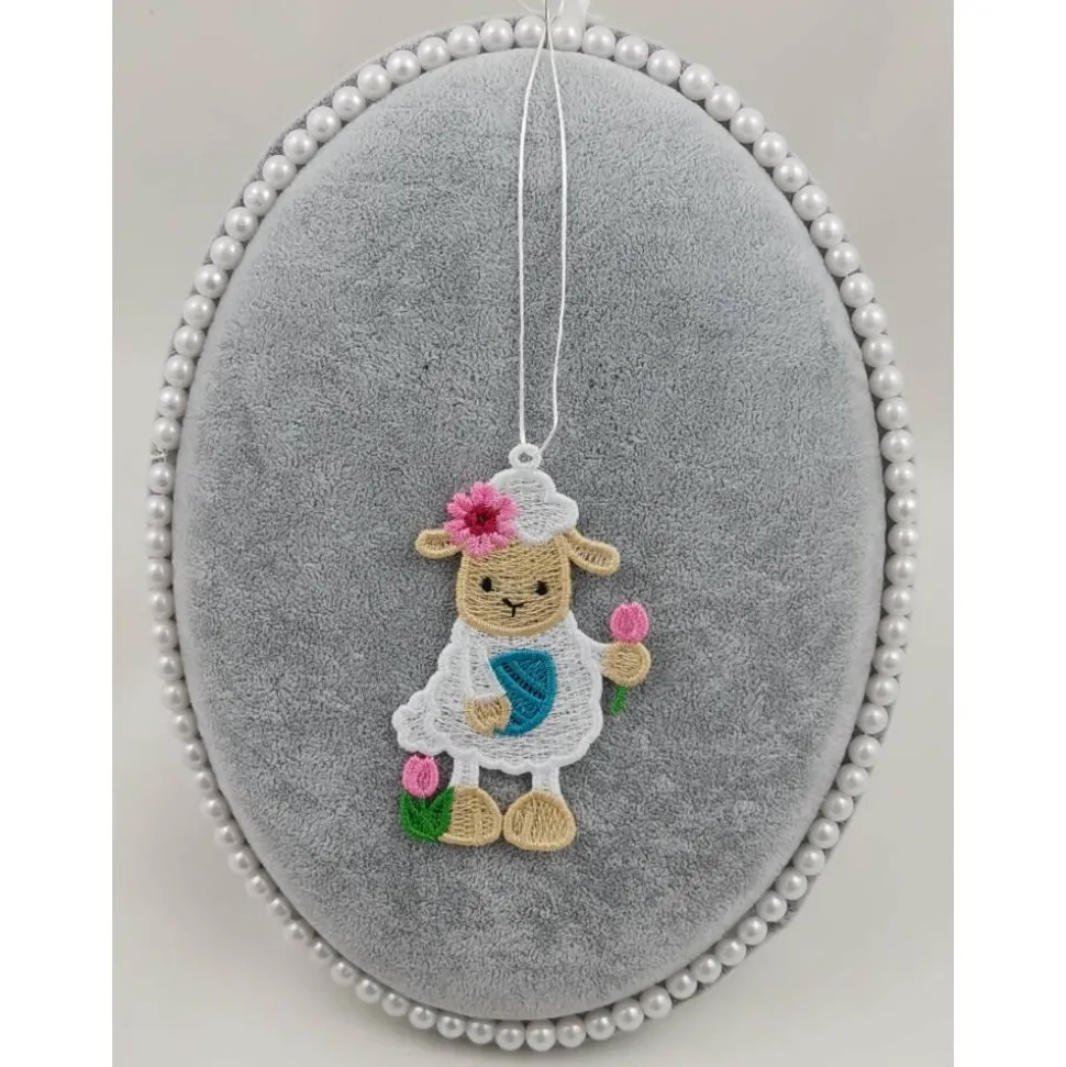 Lace Produkte werden mit einer Stickmaschine und Stickgarn auf wasserlöslichem Vlies gestickt. Nach dem Stickvorgang wird das Vlies ausgewaschen, sodass letztendlich nur die Stickerei übrig bleibt.