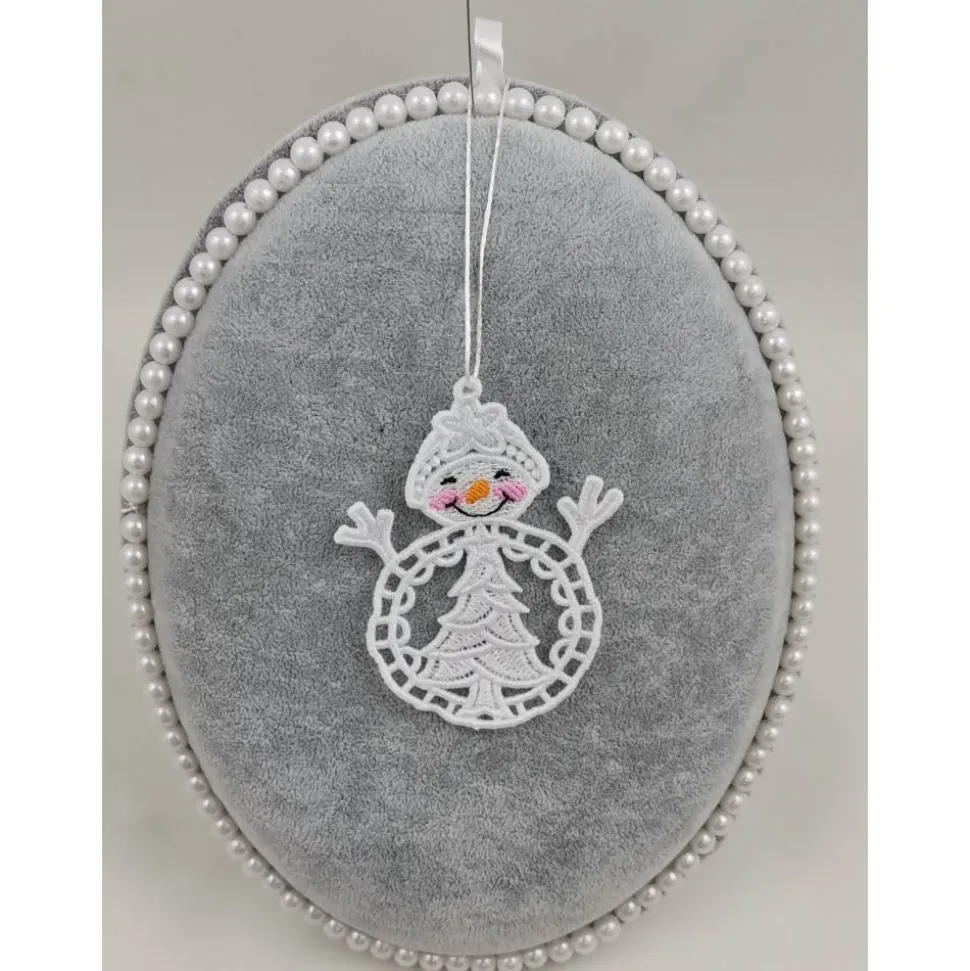 Lace Produkte werden mit einer Stickmaschine und Stickgarn auf wasserlöslichem Vlies gestickt. Nach dem Stickvorgang wird das Vlies ausgewaschen, sodass letztendlich nur die Stickerei übrig bleibt. Nach dem Trocknungsvorgang wird noch das Band zum aufhängen befestigt.