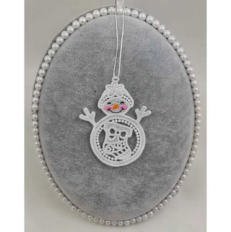 Lace Produkte werden mit einer Stickmaschine und Stickgarn auf wasserlöslichem Vlies gestickt. Nach dem Stickvorgang wird das Vlies ausgewaschen, sodass letztendlich nur die Stickerei übrig bleibt. Nach dem Trocknungsvorgang wird noch das Band zum aufhängen befestigt.