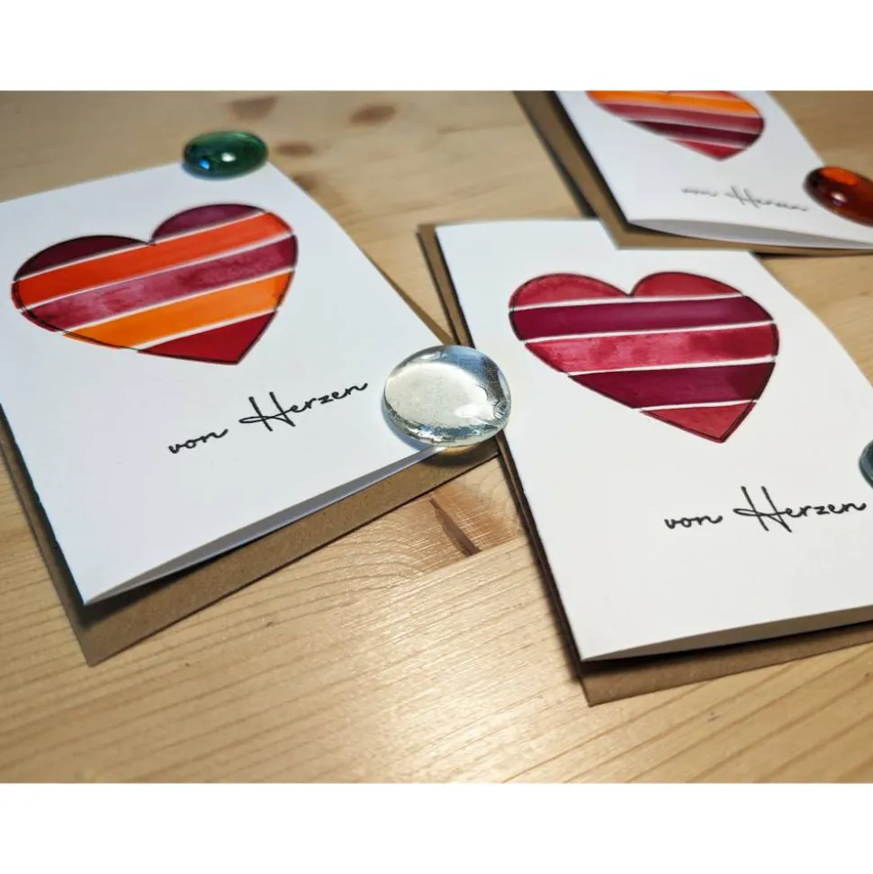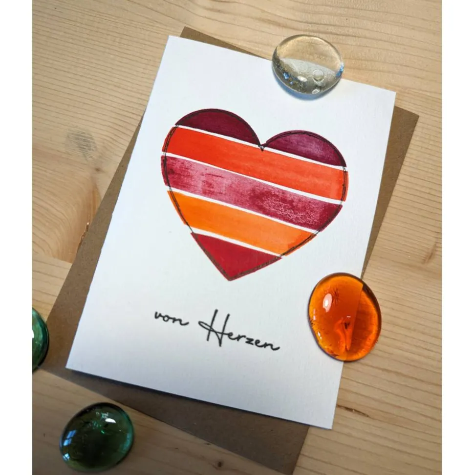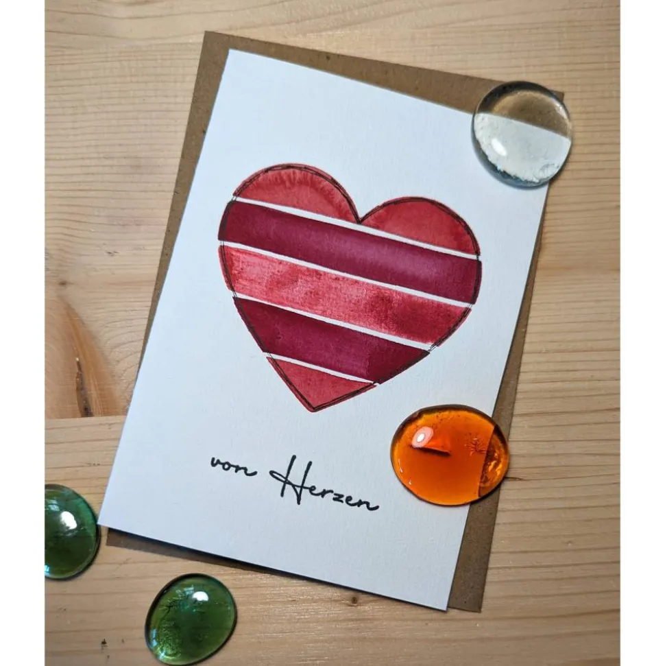 Diese naturweiße Klappkarte ist mit dem Schriftzug „Von Herzen“ bestempelt und mit einem Herz in verschiedenen Rottönen handbemalt. Die wunderschöne, farbenfrohe Karte wird durch einen Umschlag aus braunem Kraftpapier ergänzt.