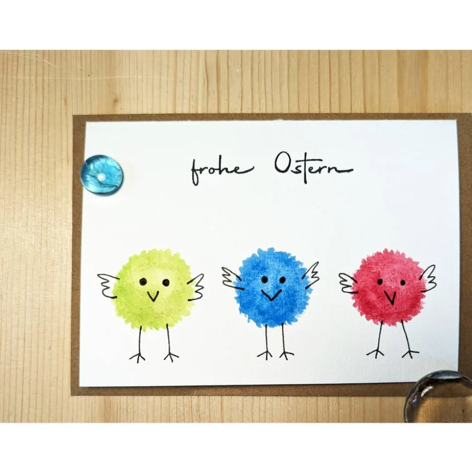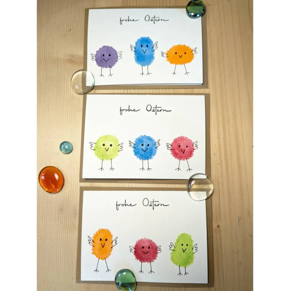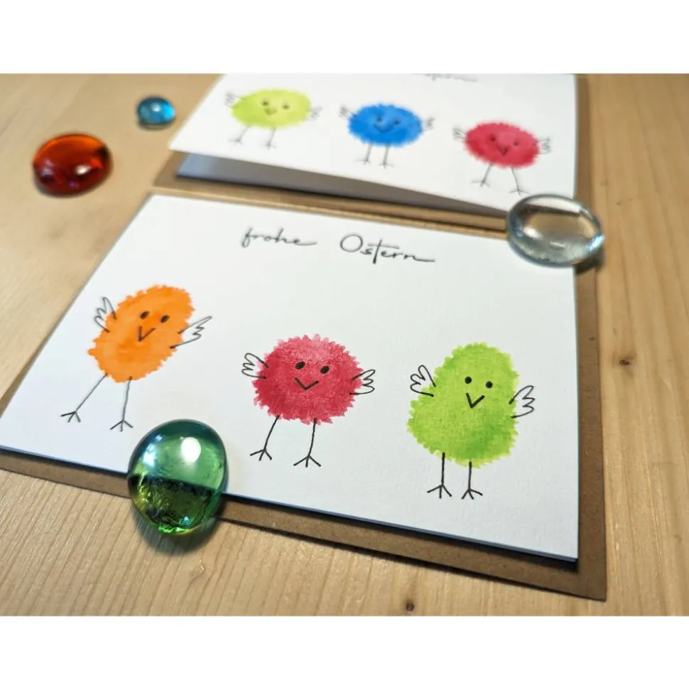 Jede Karte ist mit viel Liebe handgefertigt und unterscheidet sich leicht, u.a. in der Farbe und Form der 3 Küken. Die Fotos zeigen Beispiele. Die Auswahl erfolgt zufällig.
