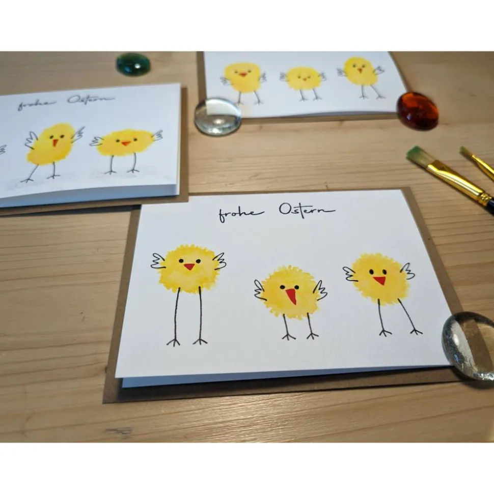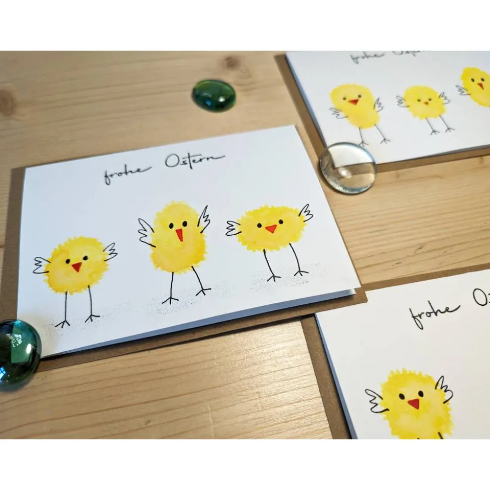 Jede Karte ist mit viel Liebe handgefertigt und unterscheidet sich leicht, u.a. in der Form der 3 Küken. Die Fotos zeigen Beispiele. Die Auswahl erfolgt zufällig.