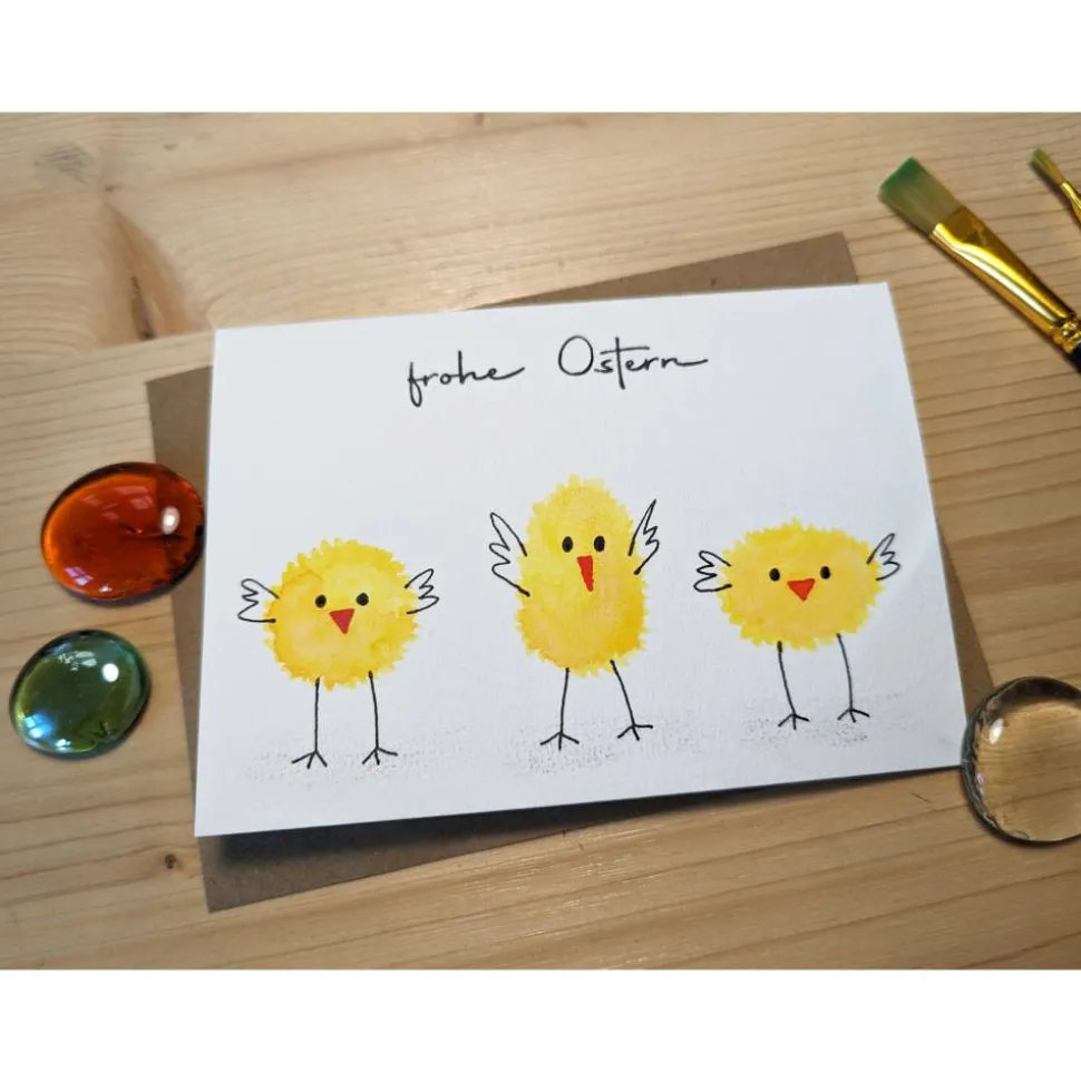 Diese naturweiße Klappkarte ist mit dem Schriftzug „Frohe Ostern“ bestempelt und mit 3 gelben Küken handbemalt. Die wunderschöne, farbenfrohe Karte wird durch einen Umschlag aus braunem Kraftpapier ergänzt.