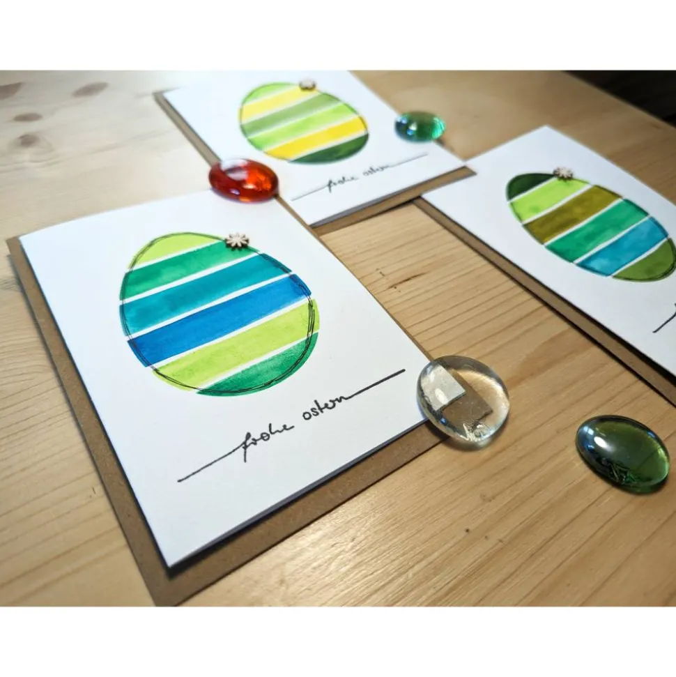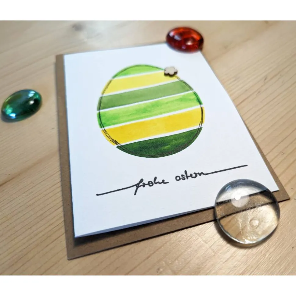 Diese naturweiße Klappkarte ist mit dem Schriftzug „Frohe Ostern“ bestempelt, mit einem Ei in Grüntönen handbemalt und einer kleinen Blüte aus Holz verziert. Die wunderschöne, farbenfrohe Karte wird durch einen Umschlag aus braunem Kraftpapier ergänzt.