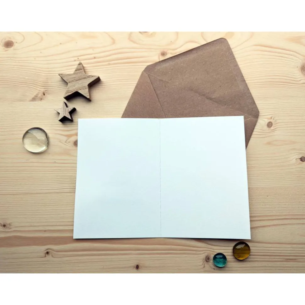 Die Karte hat ungefähr DIN A6-Größe (10,4 x 14,8 cm) und besteht aus mittelfeinem, gekörntem Aquarellpapier (300 g/m²) aus 100% Zellulose. Die Innenseite der Karte ist fast glatt. Der passende Umschlag besteht aus braunem Kraftpapier (120 g/m²).