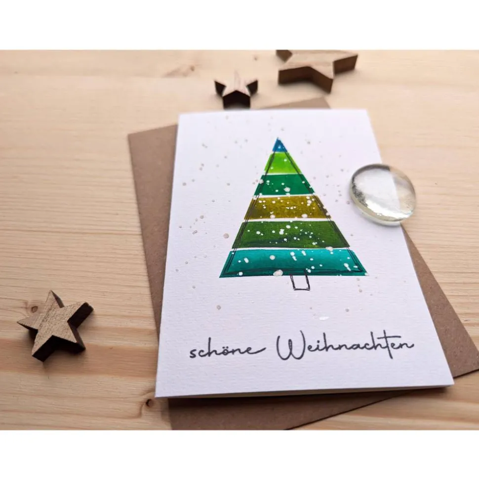Diese naturweiße Klappkarte ist mit dem Schriftzug „schöne Weihnachten“ in schwarzer Farbe bestempelt, mit einem Tannenbaum in verschiedenen Grüntönen handbemalt und mit kleinen silber-weißen Farbspritzern als Schneeflocken verziert. Die wunderschöne, farbenfrohe Aquarell-Karte wird durch einen Umschlag aus braunem Kraftpapier ergänzt.
