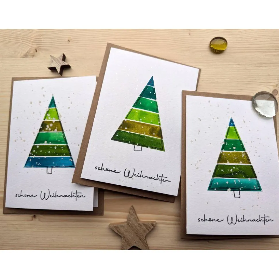 Jede Karte ist mit viel Liebe handgefertigt und unterscheidet sich leicht, u.a. in der Farbe und Abfolge der Grüntöne. Die Fotos zeigen Beispiele. Die Auswahl erfolgt zufällig.