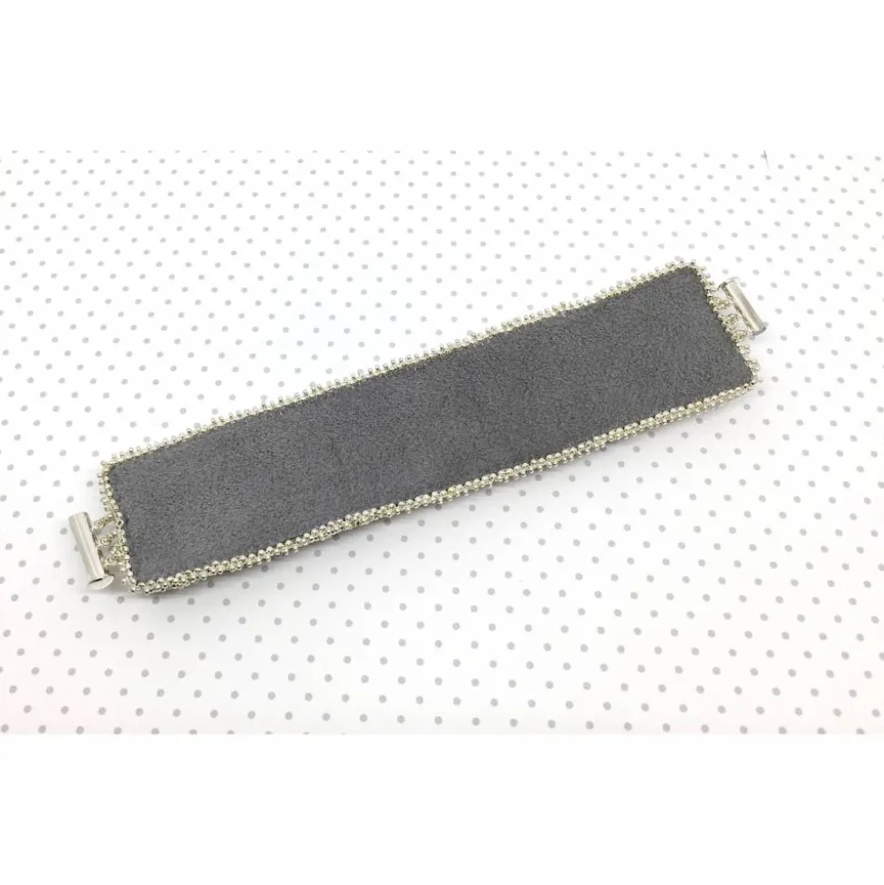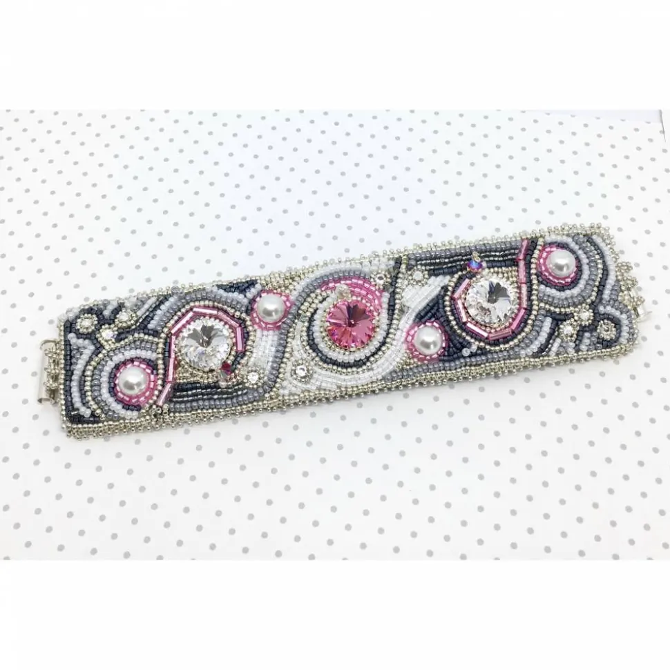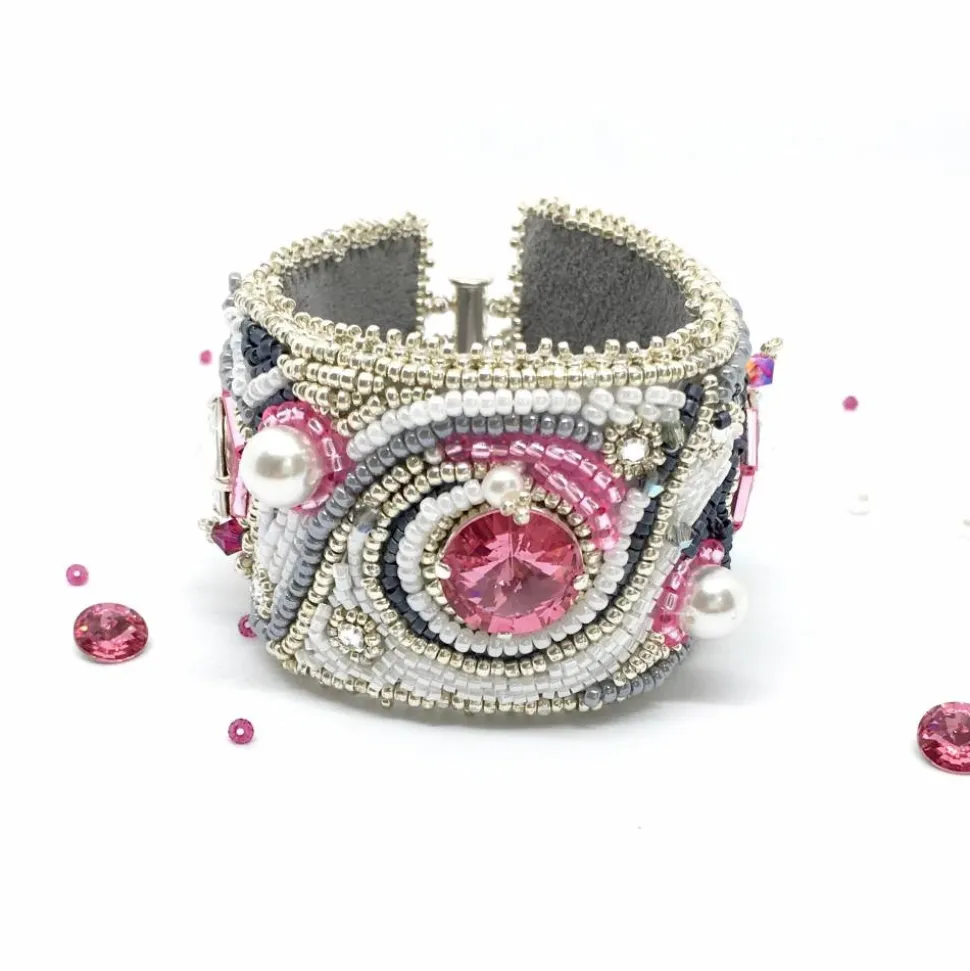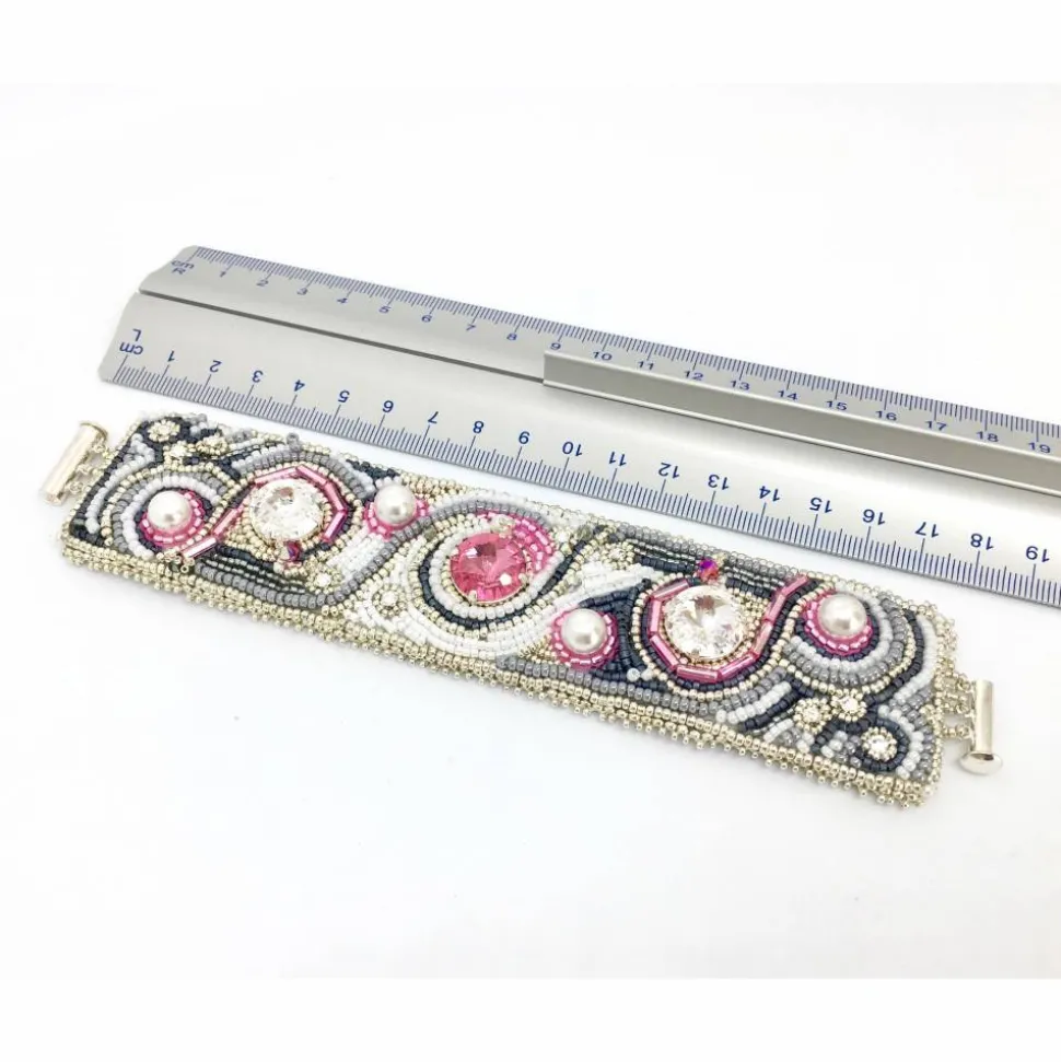Ich habe dieses besondere Armband aus verschiedenen hohwertigen Perlen, Swarovski Elements ( Rivoli, Doppelkegel) und Wachsperlen gestickt. Der 3-strangige versilberte Verschluss ist magnetisch. Die Rückseite ist mit Ultra Suede grau gefüttert, ein sehr weicher Stoff.