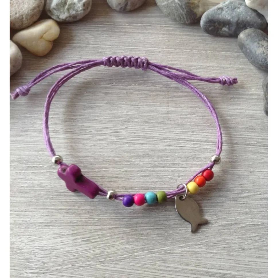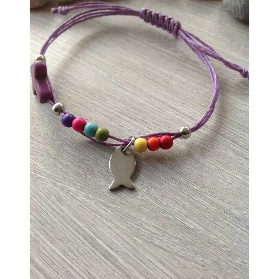 Das dreireihige Armband aus fliederfarbenen, gewachstem Baumwollband ( je 1mm stark ) ist mit einem kleinen Howlithkreuz ( ca 12mm x 16mm ), einem kleinen Edelstahlfisch ( Höhe ca 1 mm ) und bunten Howlithperlen verziert. Fixiert sind die einzelnen Elemente durch Crimpperlen. Die Länge des Armbandes lässt sich durch Verschieben des Knotens variieren. Sollte es zu lang sein- einfach die Enden neu verknoten und das ‚zu viel‘ abschneiden.