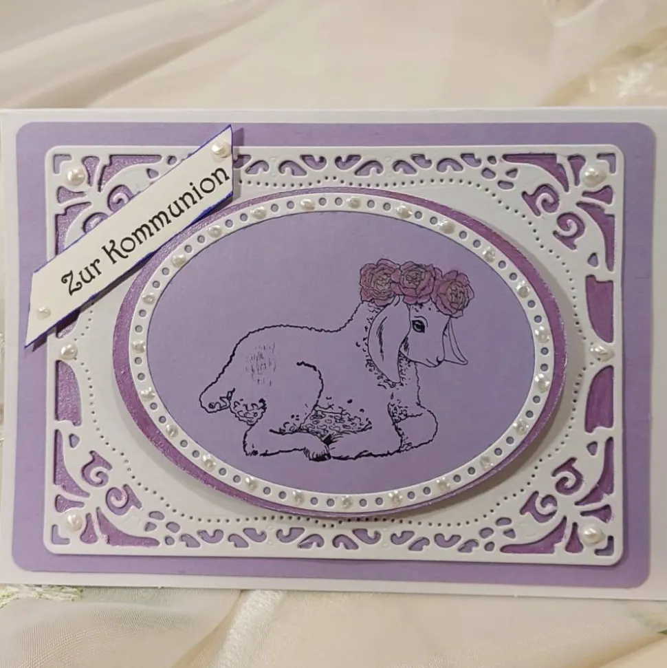 Aufwändige Kommunionkarte Lamm mit Rosenkrone lila weiß