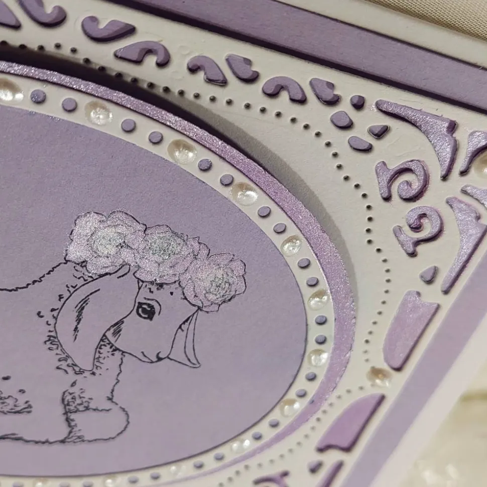 Aufwändige Kommunionkarte Lamm mit Rosenkrone lila weiß