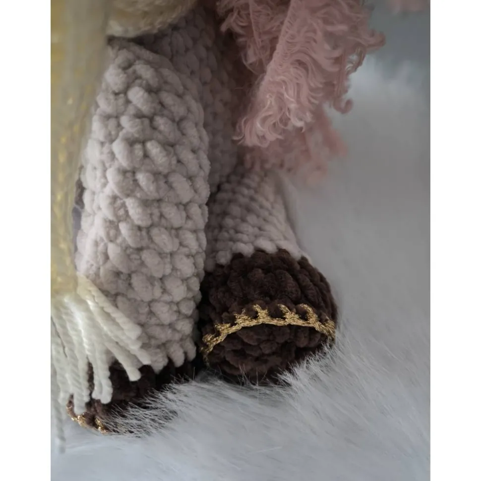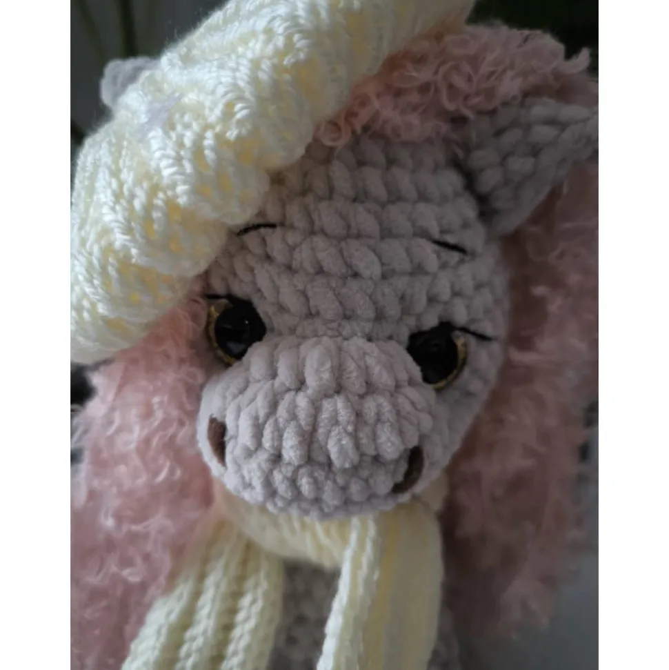 Aurora ist ein zartes, handgehäkeltes Pferdchen aus weicher Chenille-Wolle, etwa 28 cm groß und voller winterlicher Magie. Mit ihrer rosa Mähne und den abnehmbaren Accessoires wirkt sie, als käme sie direkt aus einer Weihnachtsgeschichte.