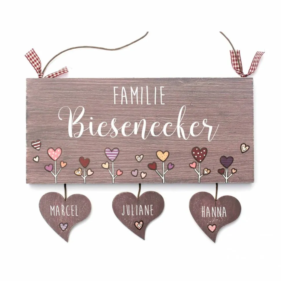 Verschenke ein ausgefallenes Hochzeitsgeschenk, das Herzen berührt: Das dekorative Türschild Familie mit Name wird liebevoll aus Holz handgefertigt und individuell nach Deinen Vorgaben personalisiert. Ob als Hochzeitsgeschenk, Einzugsgeschenk oder für andere Anlässe – dieses Haustürschild überzeugt durch elegantes Design, hochwertige Verarbeitung und wetterfeste Eigenschaften.
