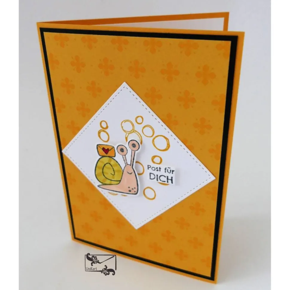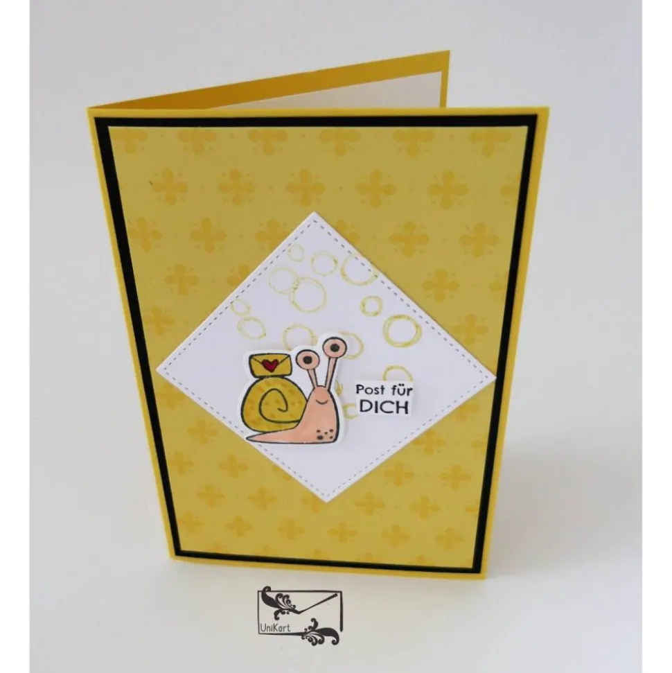 Die Schnecke und das Etikett sind auf Abstandshalter gesetzt, sodass ein 3D Effekt entstanden ist.