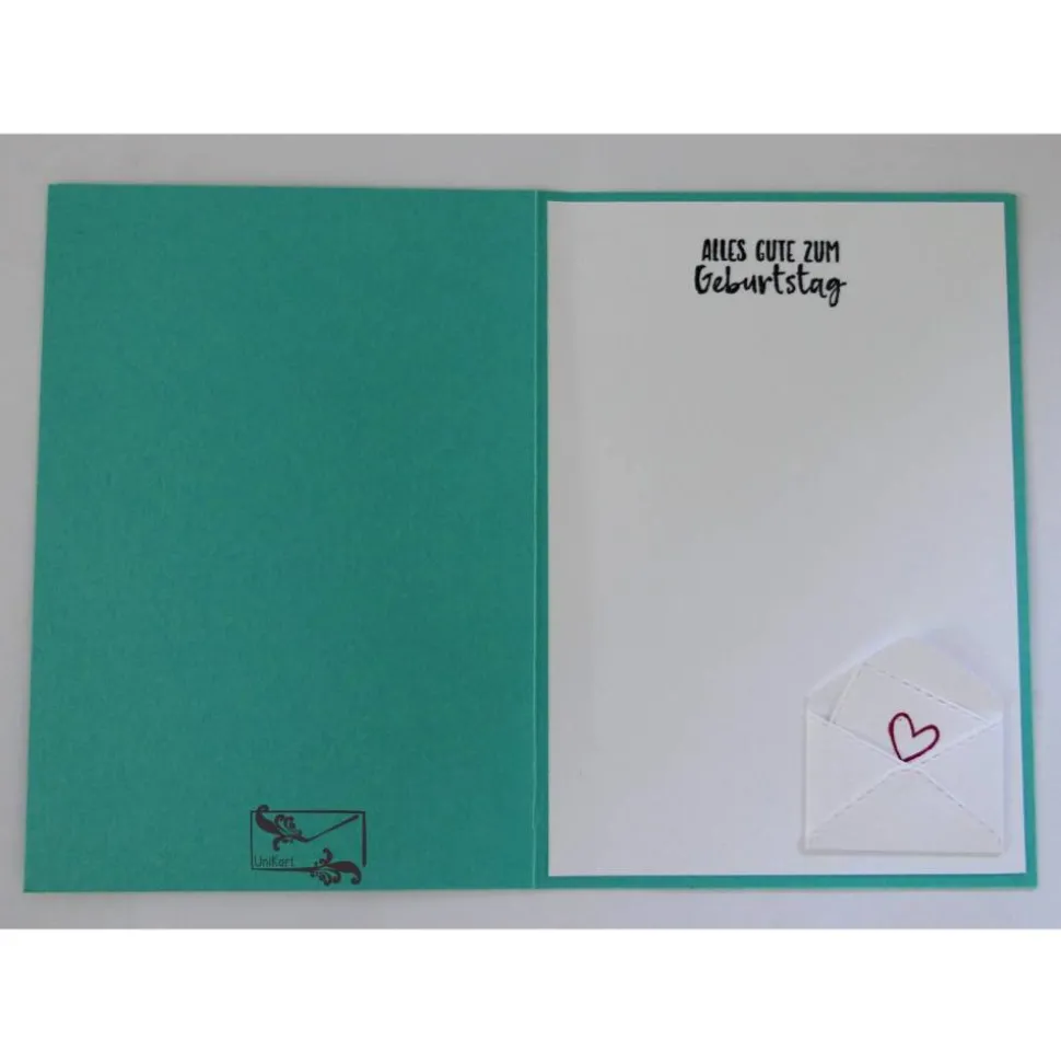 Im Inlett ist ein Stempelspruch „Alles Gute zum Geburtstag“ aufgestempelt. Ein Briefumschlag im Inlett enthält einen Brief mit einer Botschaft.