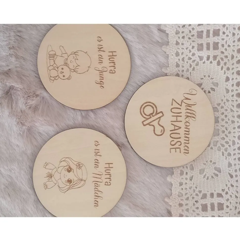 Das Set beinhaltet 15 runde Holz-Kreise, verpackt in einem Baumwollbeutel und mit dem Namen( wenn gewünscht) versehen.