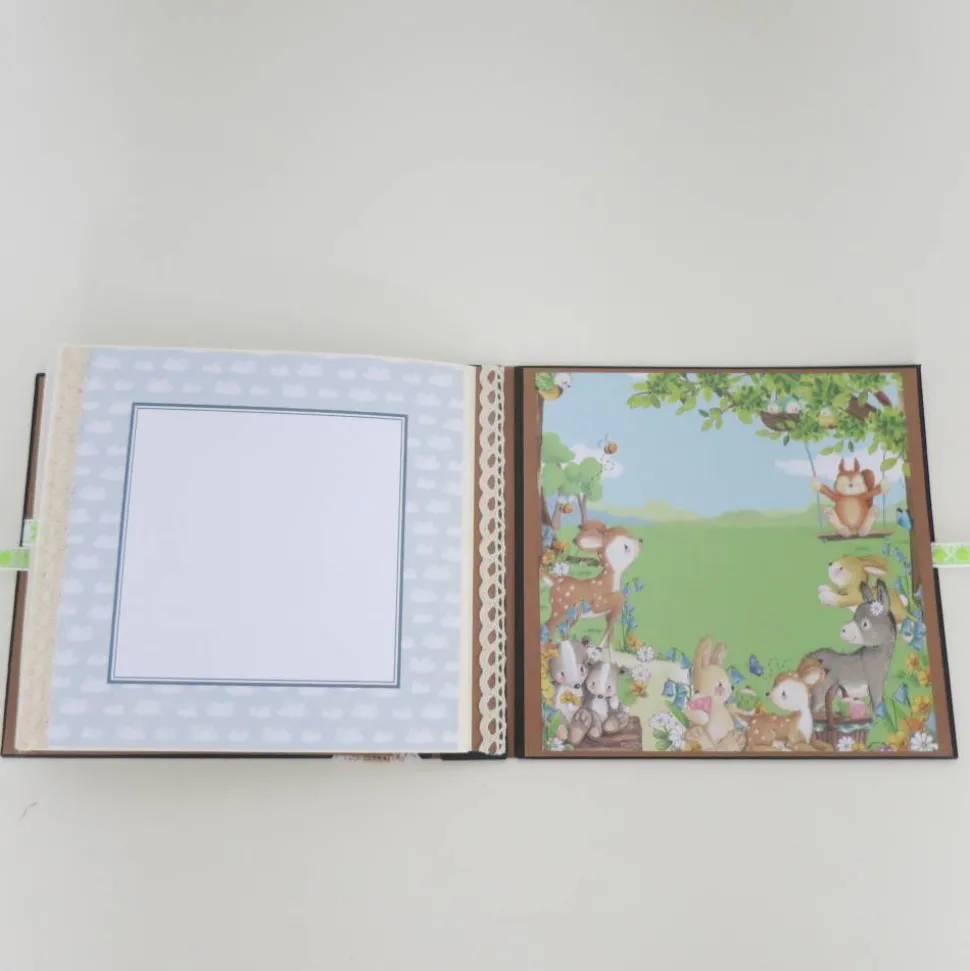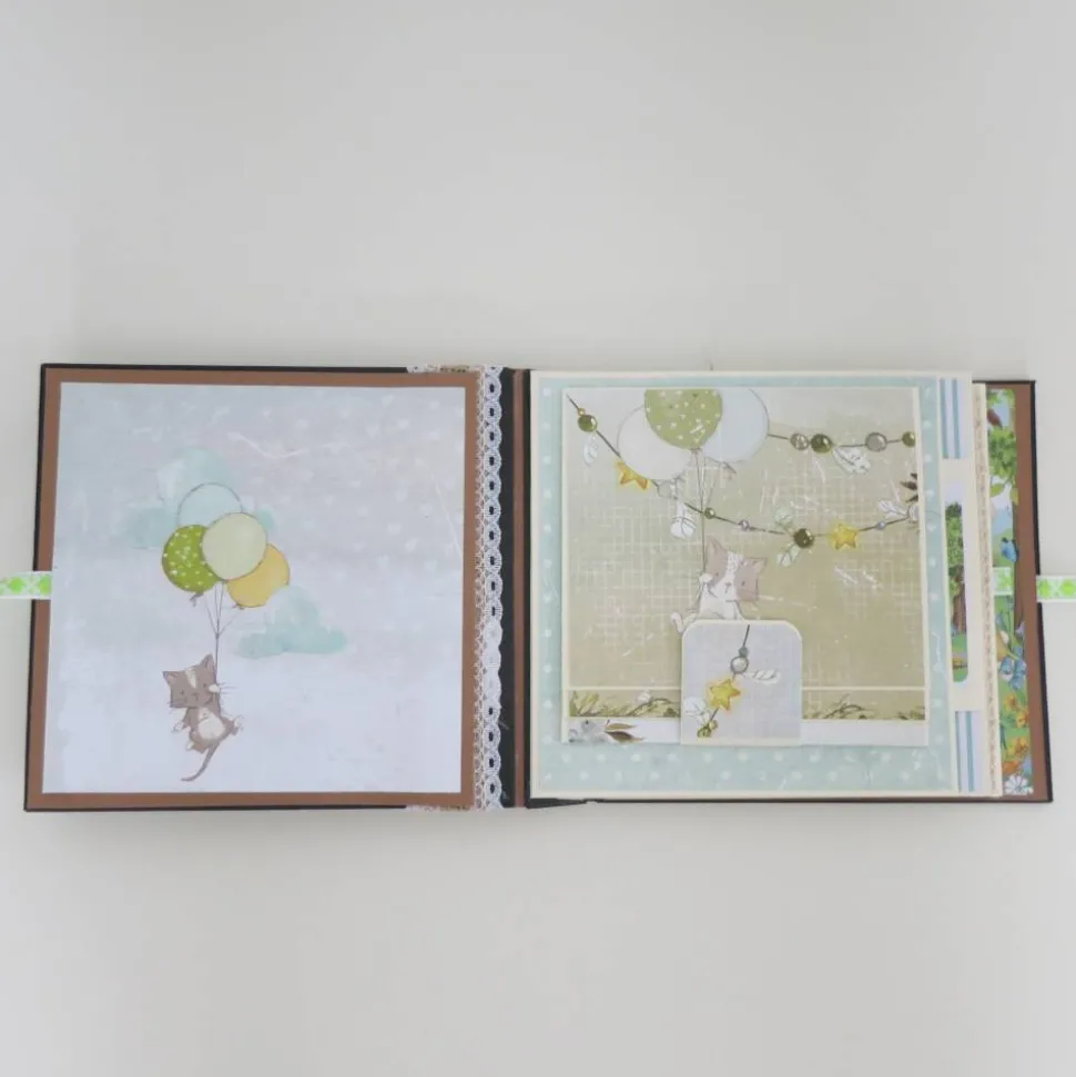 Das Album bietet Platz für 20 Fotos in verschiedenen Größen. Das Album wird mit einem Schleifenband verschlossen.