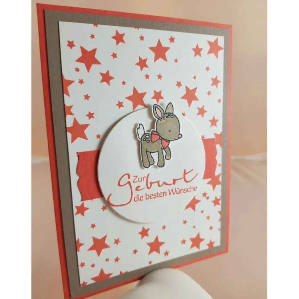 Diese Karte wurde gefertigt in den Farben Weiß, Koralle und Taupe. Der Hintergrund wurde mit vielen Sternen in Koralle bestempelt. Der Glückwunsch auf dem Kreis wurde mit Abstandklebepads auf der Grundkarte angebracht, das Rehkitz wurde von Hand coloriert, ausgeschnitten und ebenfalls mit Abstandklebepads aufgebracht und hebt sich dadurch noch etwas mehr ab.