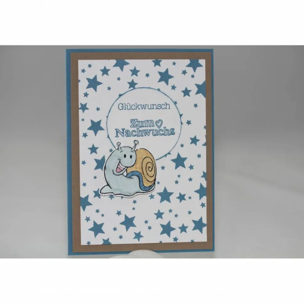 Verwendet wurden die Farben Flüsterweiß, Ozeanblau und Savanne. Der Hintergrund wurde mit vielen Sternen bestempelt. Der Kreis mit dem Glückwunsch wurde ausgestanzt und an den Rändern mit ozeanblauer Farbe gewischt. Die Schnecke wurde gestempelt, handcoloriert und ausgeschnitten und dann mit Abstandklebepads auf die Karte geklebt.