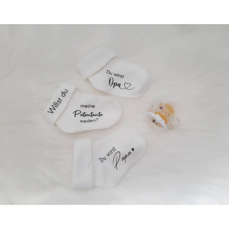 Die Deko-Socke ist weiß mit hochwertigem schwarzen Aufdruck und wird ohne weitere Deko geliefert. Die Baby-Socke eignet sich auch ideal, um eine wichtige Frage wie „Willst du mein Patenonkel werden?“ zu stellen und ist das perfekte Geschenk für werdende Eltern, Großeltern, Tanten, Onkel oder Paten.