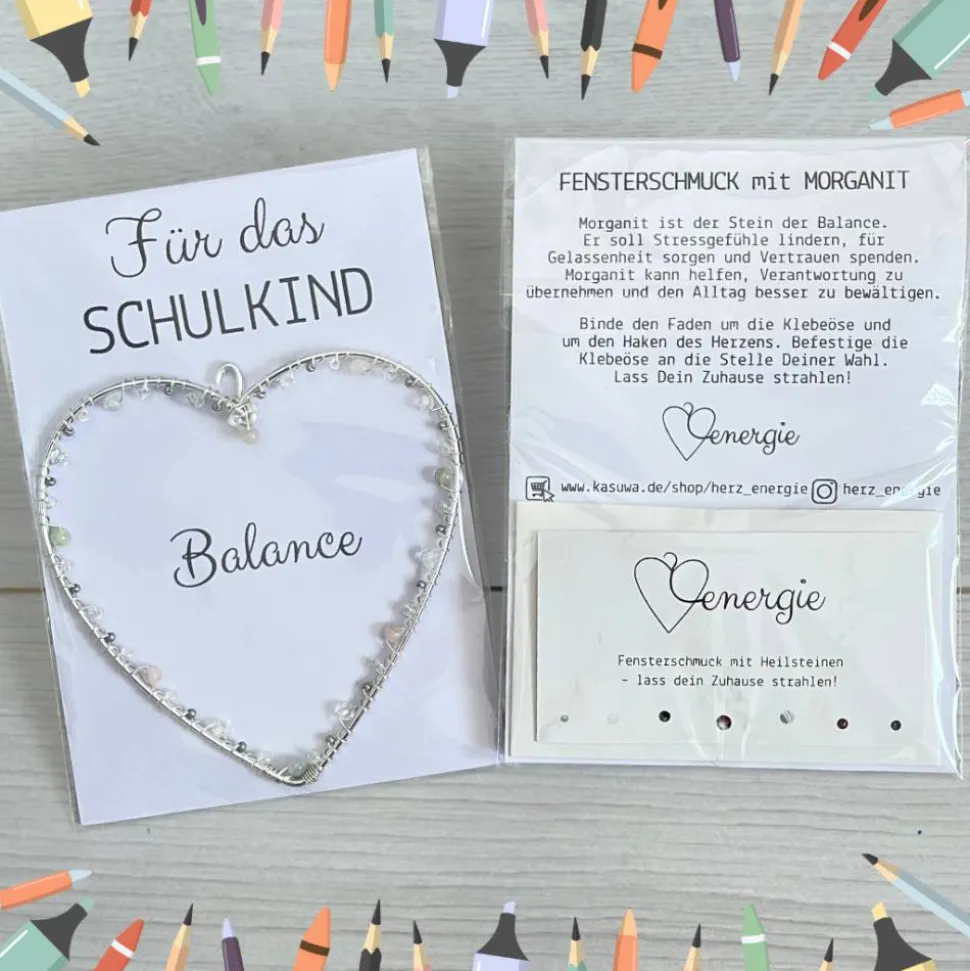 Die Fensterdeko mit Heilstein eignet sich perfekt als Einschulungsgeschenk, wobei es kein Wegwerf-Produkt ist. Das neue Schulkind kann das Herz am Fenster, an der Tür oder über dem Bett aufhängen und so lenkt es die Gedanken unbewusst auf die schönen Wirkungen des Steins. Das gibt genau die gewünschte BALANCE, die das Kind für den Schulstart braucht. Der Fensterschmuck schenkt langfristig Schönheit und Achtsamkeit in den Alltag und bringt das Zuhause zum Strahlen.