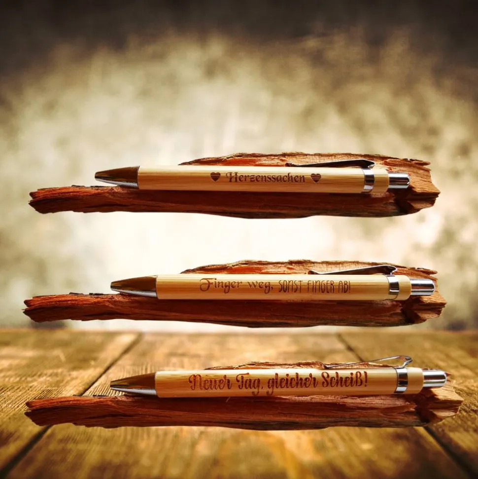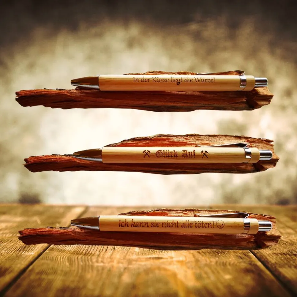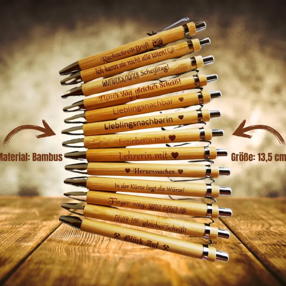 Entdecke den Bambus Kugelschreiber mit Lasergravur – das perfekte Accessoire für individuelle Geschenke und Werbeanlässe. Jeder Kugelschreiber wird aus hochwertigem Bambus gefertigt und mit modernster Lasertechnologie graviert, sodass du deinen Wunschtext, Namen, lustigen Spruch oder sogar deinen Firmennamen personalisieren kannst.