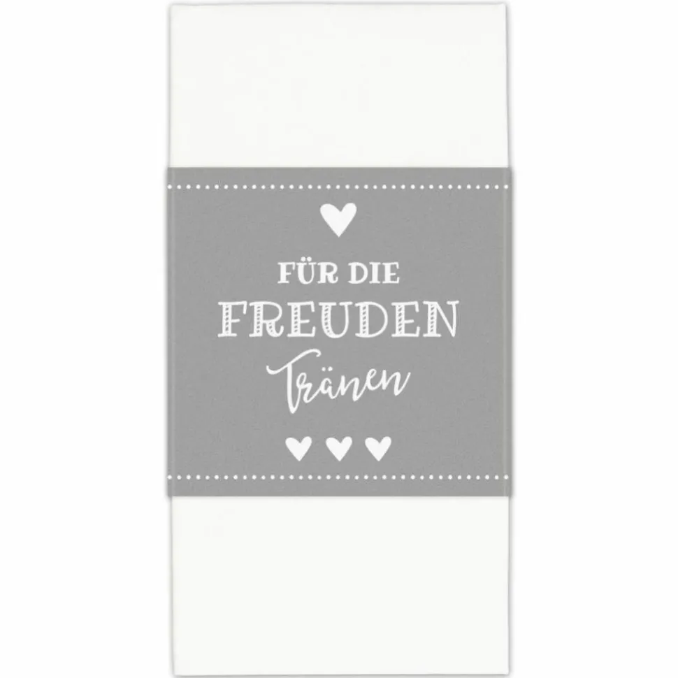 Einfach das Taschentuch in die Mitte der Banderole legen, die Banderole umfalten und mit einem der beiliegenden Klebepunkte verschließen. Fertig!