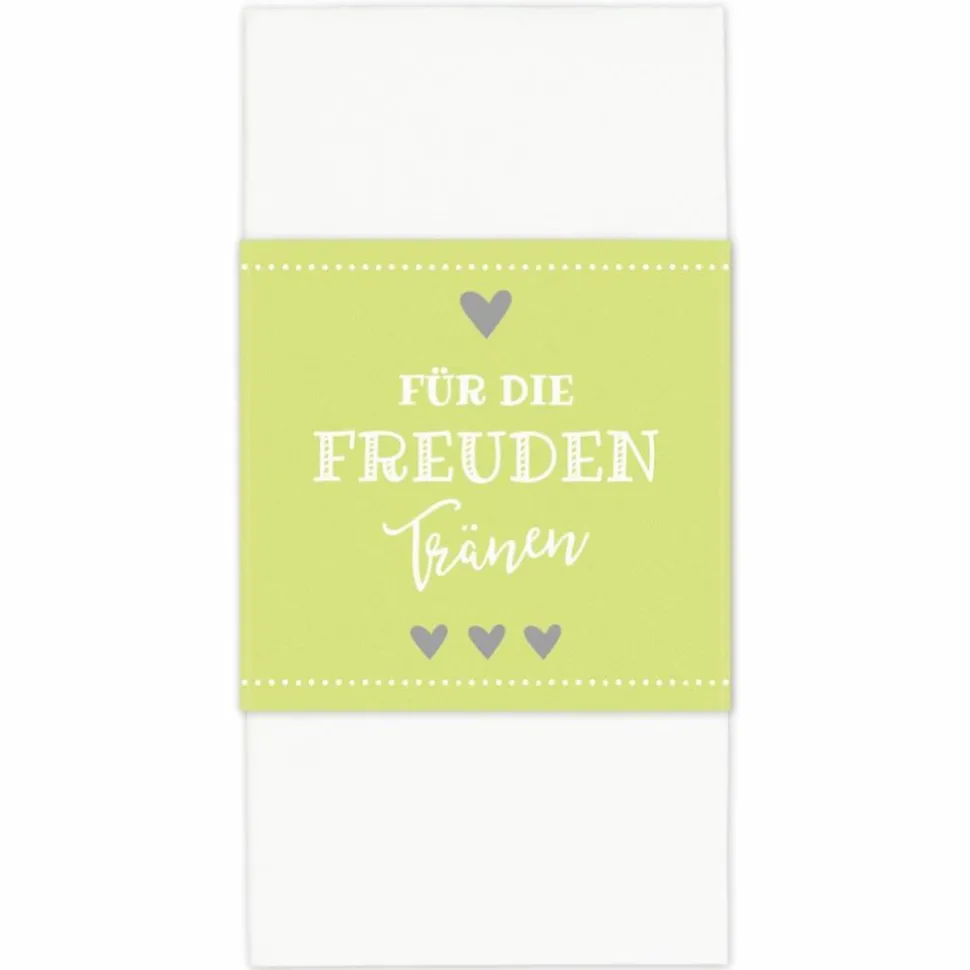 Einfach das Taschentuch in die Mitte der Banderole legen, die Banderole umfalten und mit einem der beiliegenden Klebepunkte verschließen. Fertig!