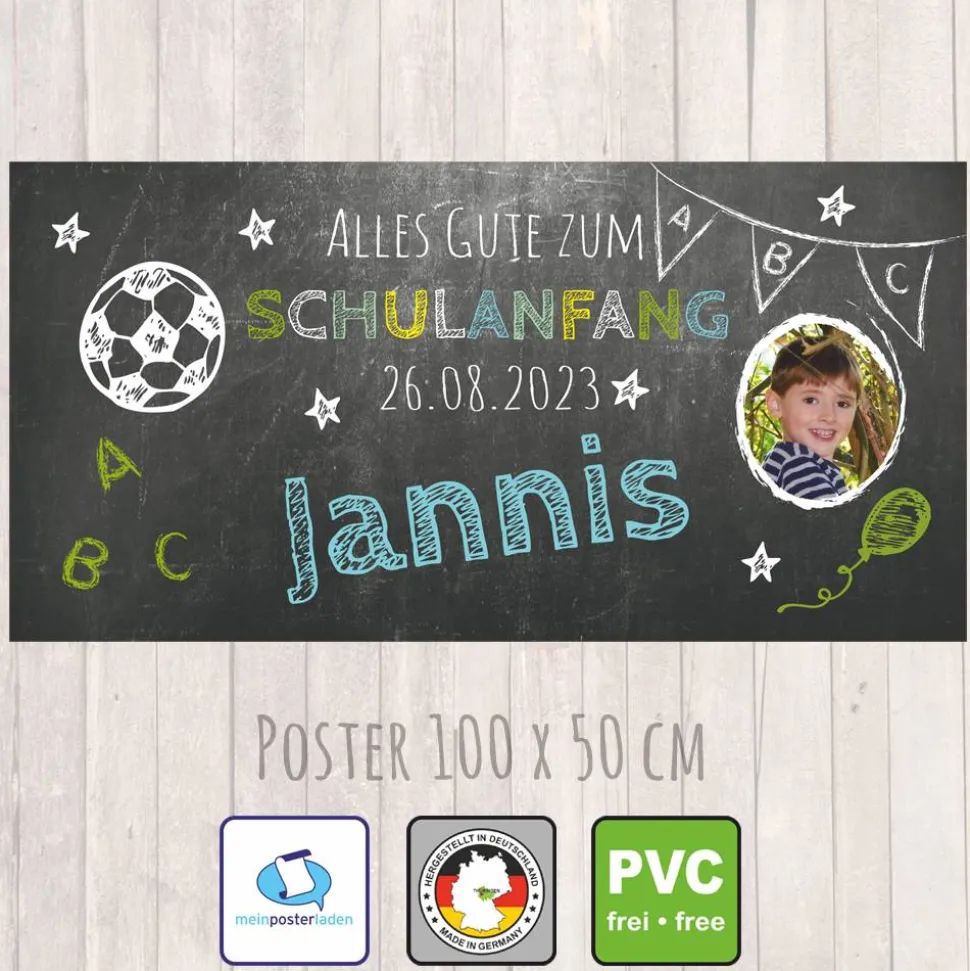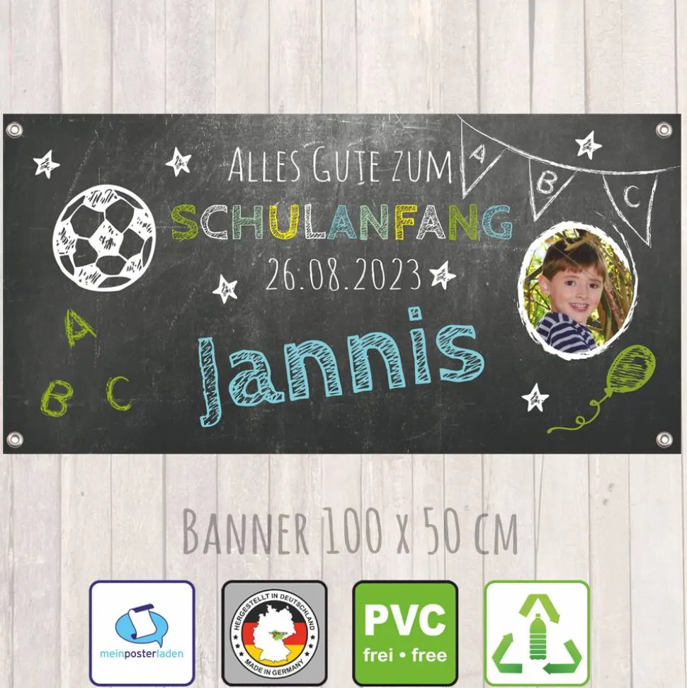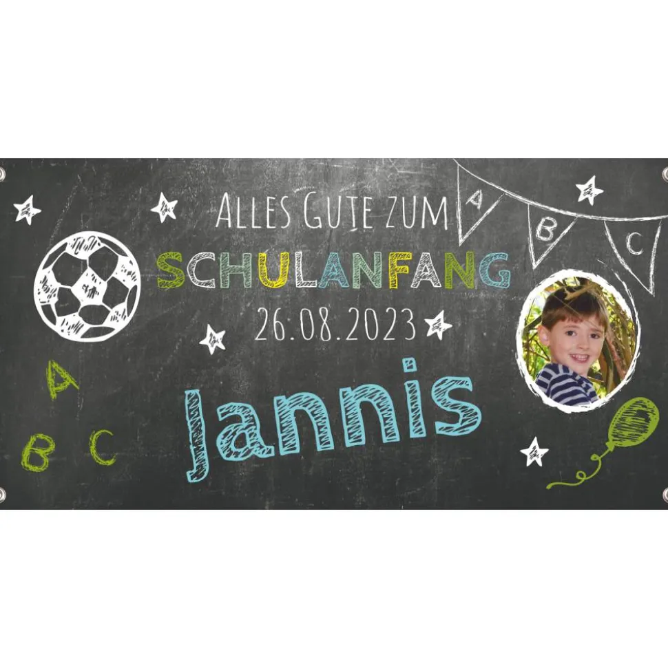 Bedrucktes und personalisierbares Banner zum Schulanfang, mit Fußball und Kreideschrift auf Tafeloptik, mit Foto, Name, Datum personalisierbar