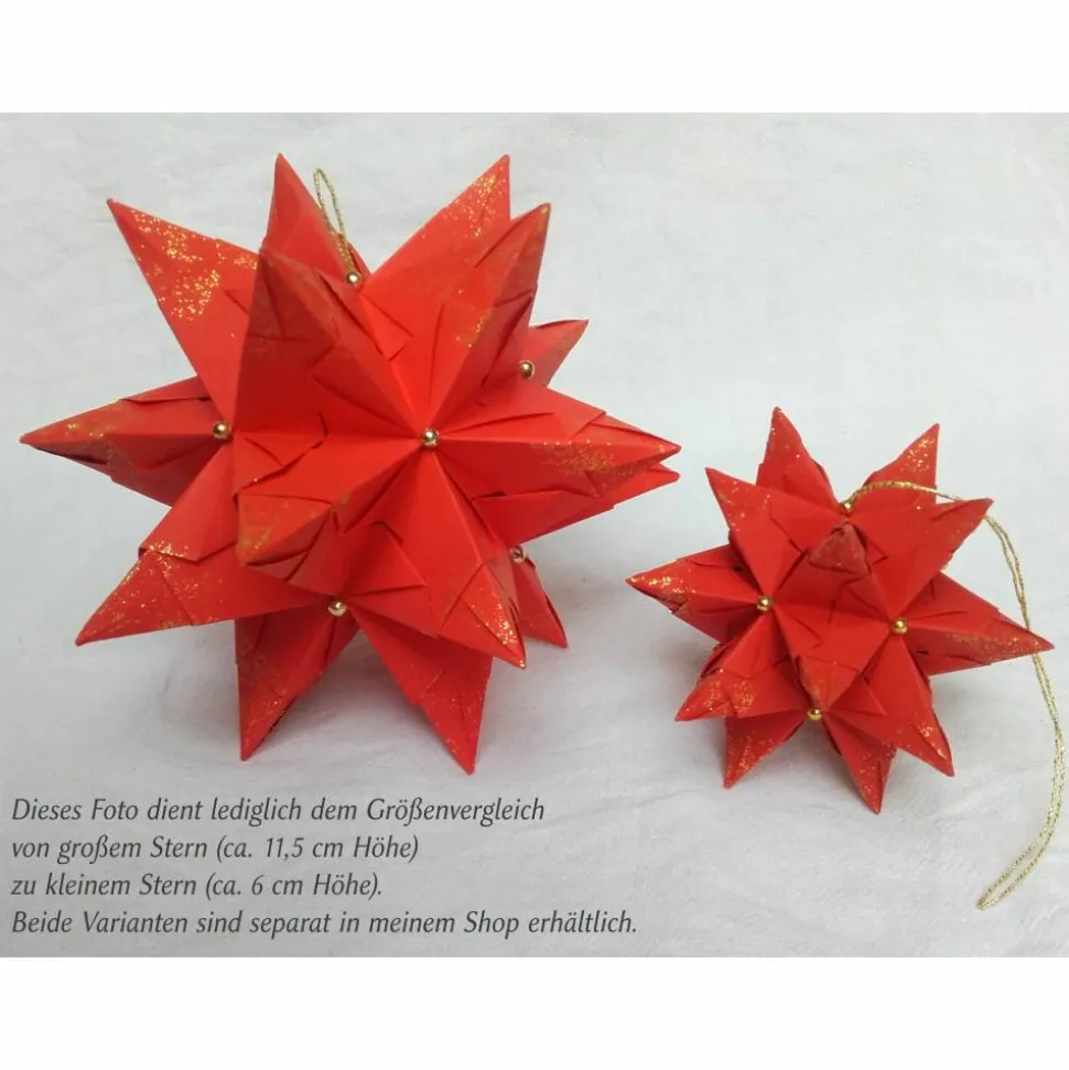 Der Stern ist mit Goldglitter und goldfarbenen Kunststoffperlen verziert. Eine kleine Schlaufe aus Metallic-Garn ist daran befestigt, durch welche Sie einen Faden ziehen können, um den Stern im Fenster aufzuhängen. Sie können ihn jedoch auch einfach an einem schönen Platz aufstellen.