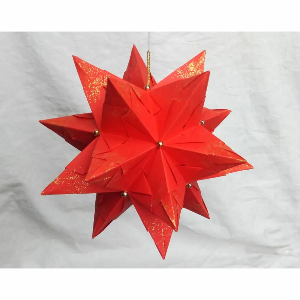 Der Bascetta-Stern besteht aus 30 einzelnen aus Papier gefalteten Elementen, die ohne Kleber zusammengesteckt werden. So entsteht ein kompakter, dreidimensionaler Stern.