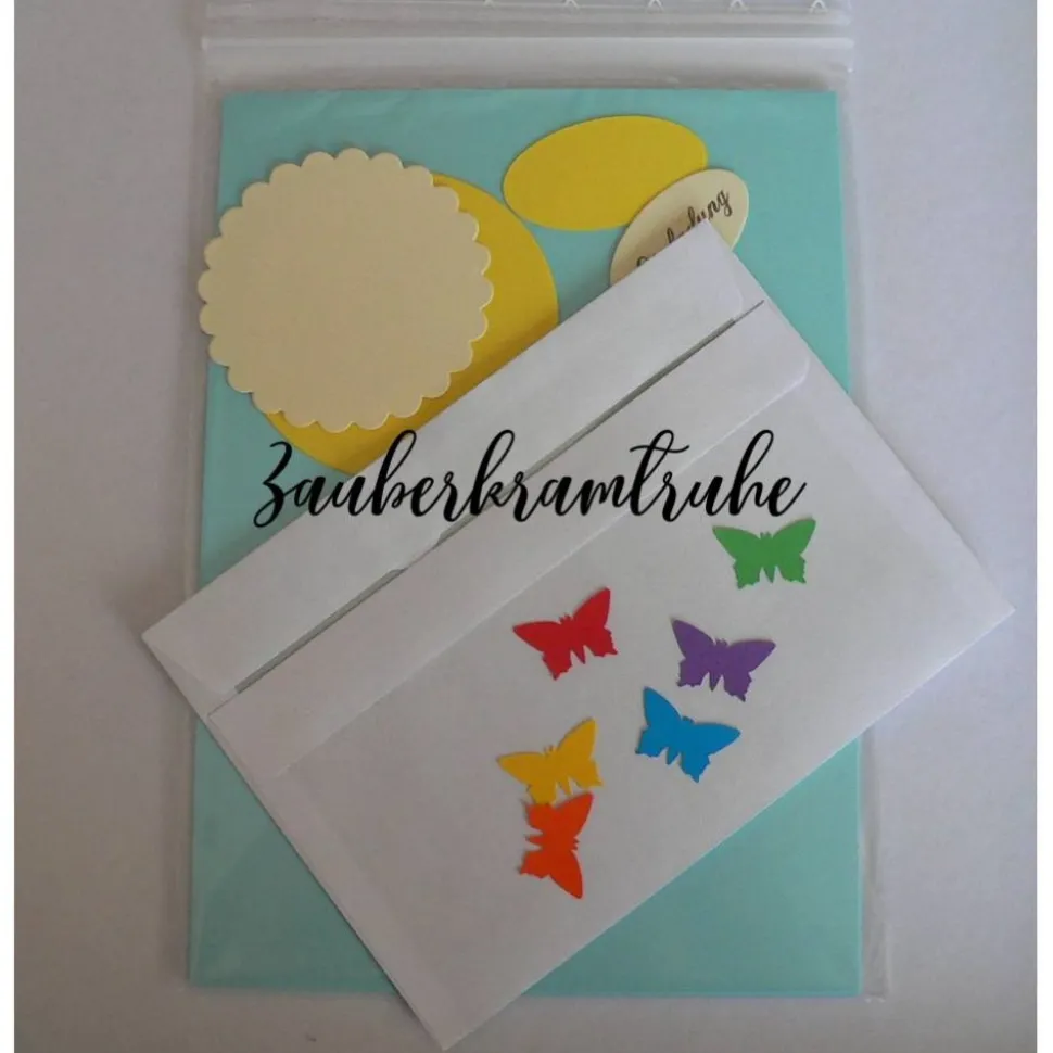 Dieses Bastelset für Einladungen bezaubert durch regenbogenbunte Schmetterlinge und ist für verschiedene Mottos zur Kommunion geeignet. Es besteht aus 160g/m² Papier und ist liebevoll von Hand vorbereitet (zugeschnitten, gestanzt, gestempelt und zusammengestellt). Eine Anleitung zum Basteln liegt bei.