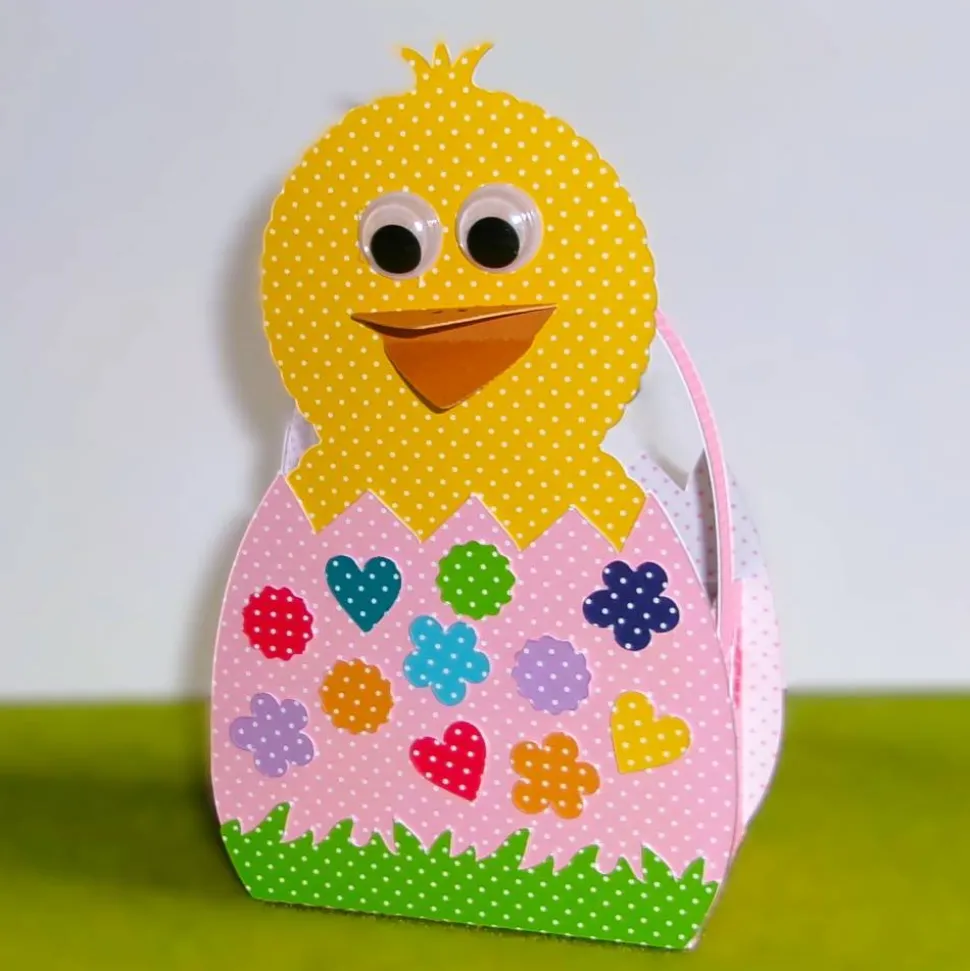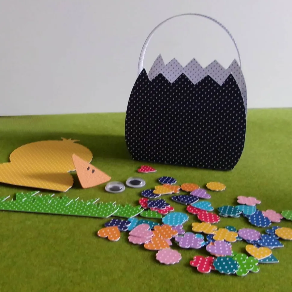 Der Korb selbst ist bereits vorgefaltet und muss nur noch zusammengefügt werden. Auf das Küken werden Schnabel und Wackelaugen geklebt und zum Dekorieren bekommt ihr zwei Grasstreifen und ca. 60 Schnipsel in 10 Farben.