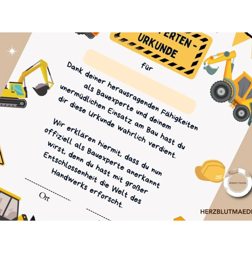 Mit dieser personalisierten Urkunde schenkst du den Kids nicht nur ein cooles Partygeschenk, sondern auch eine bleibende Erinnerung an diesen besonderen Tag. Du wirst sehen, wie die Augen der kleinen Bauexperten leuchten, wenn sie ihre eigene Urkunde bekommen.