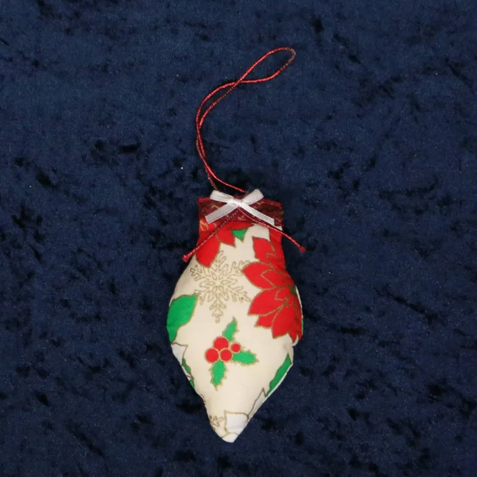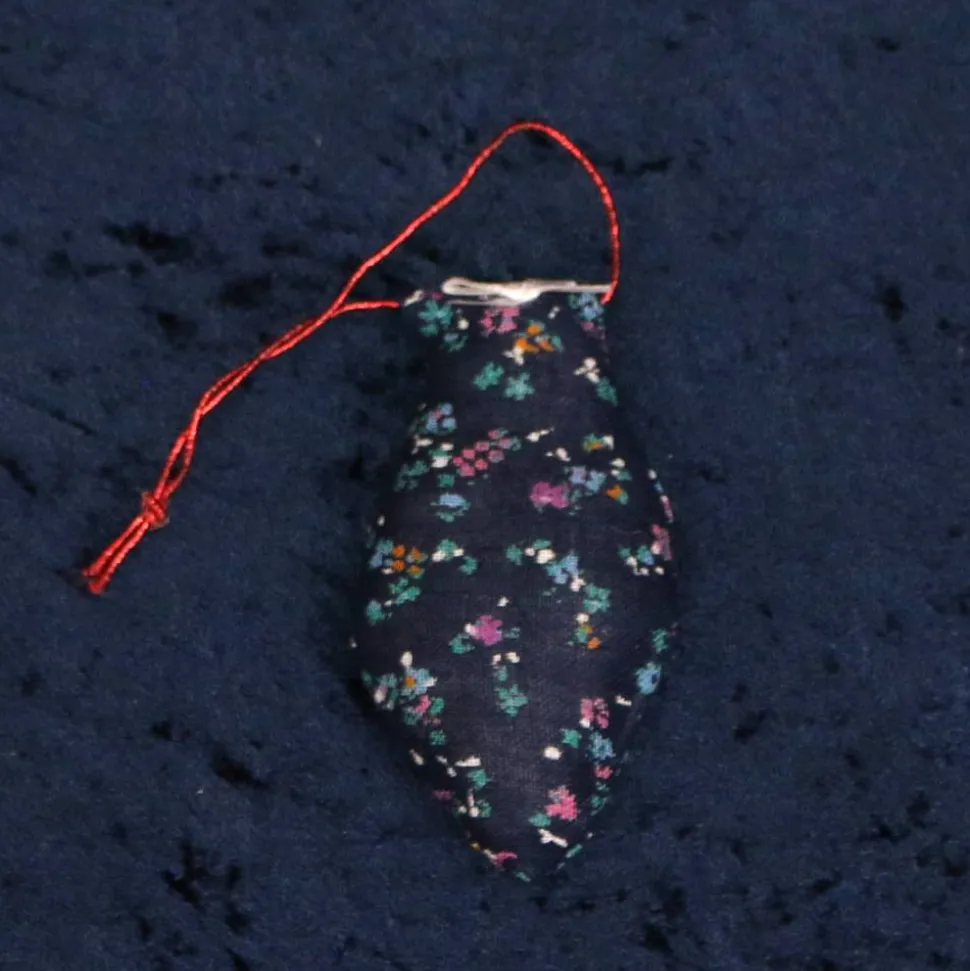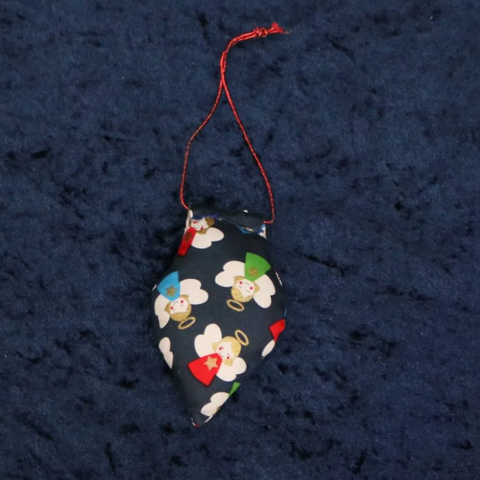 Hübscher weihnachtlicher Baumanhänger aus Stoff in Zapfenform in verschiedenen Farben: beige/rot; blau/Blümchen; blau mit kleinen Engeln. Höhe ca. 11 cm, Breite ca. 6 cm. Befüllt mit Polyesterfüllwatte. Waschbar, nicht trocknergeeignet.
