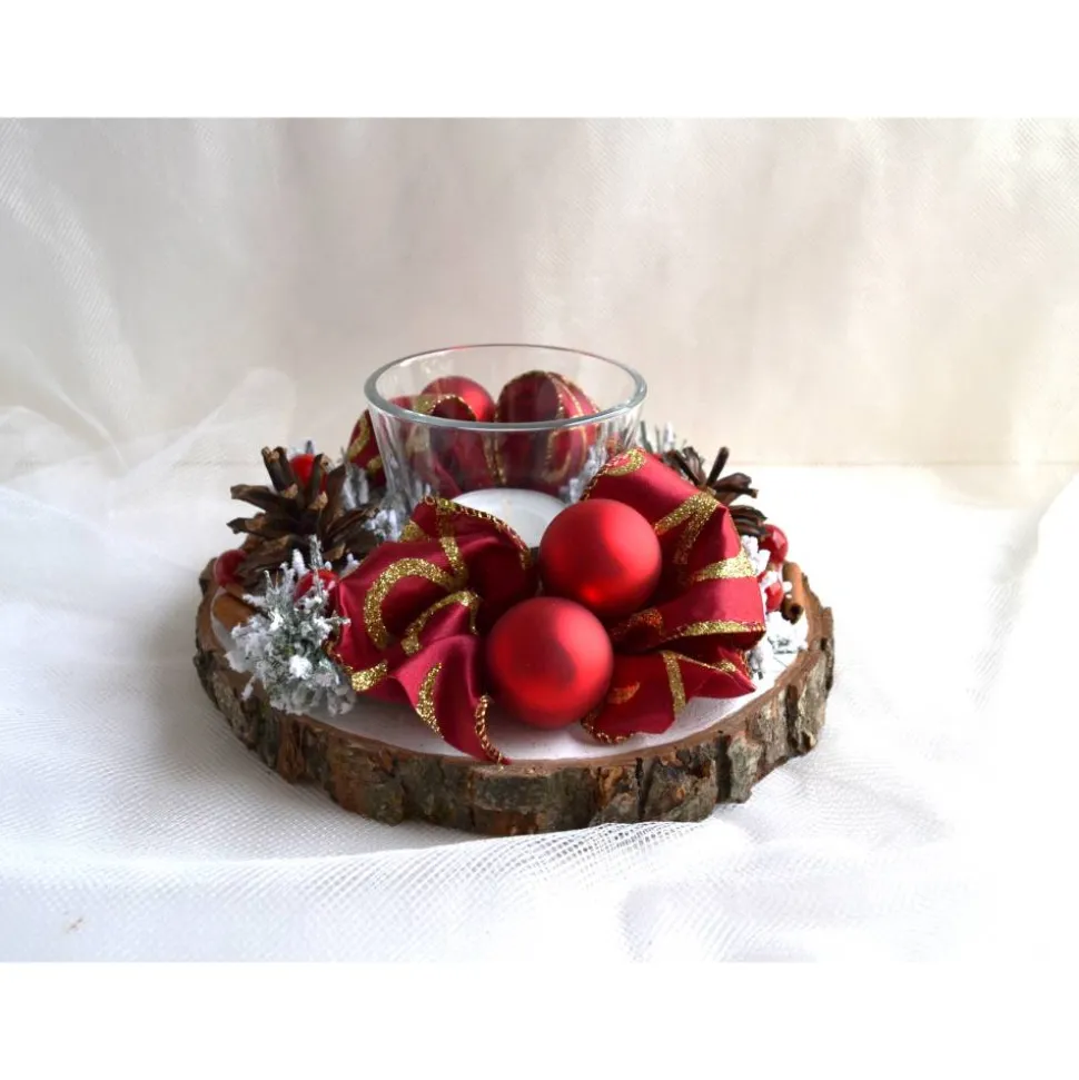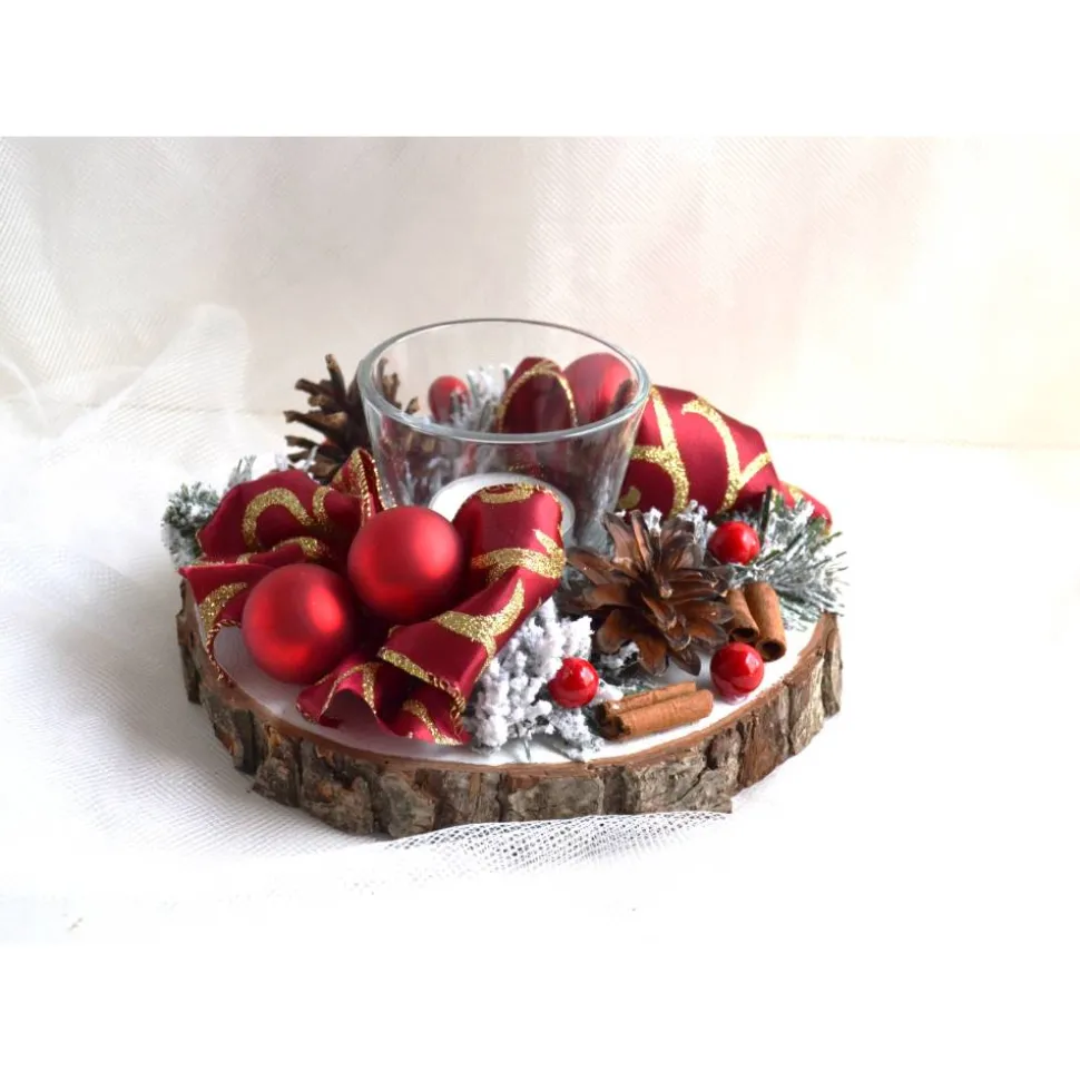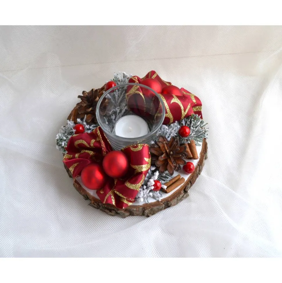 Dieses schöne Weihnachtsgesteck ist eine schöne Dekoration für den Tisch oder das Sideboard. Es ist liebevoll von Hand auf eine Baumscheibe dekoriert. Die Schleife ist in traditioneller Weihnachtsfarbe rot-gold. Es versprüht einen romantischen und weihnachtlichen Charme.