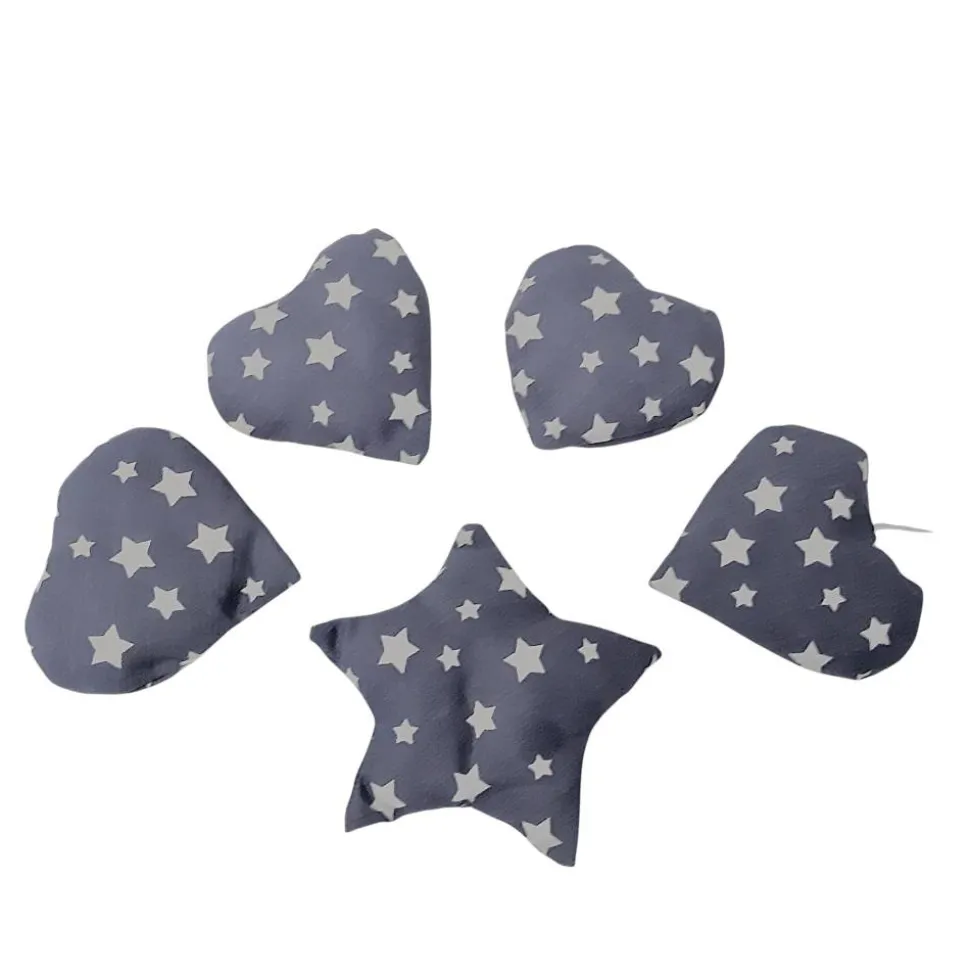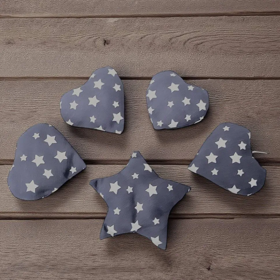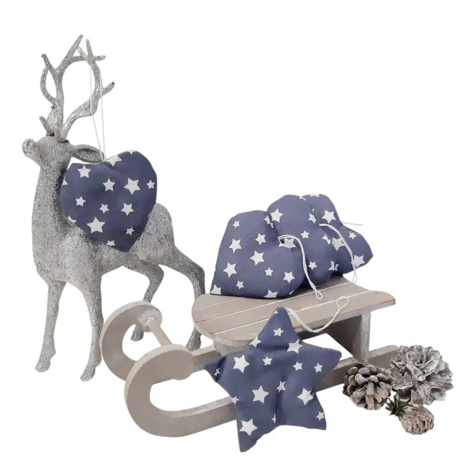 5er Set Christbaumschmuck aus Baumwolle genäht und mit Füllwatte aus Polyester befüllt. Auch geeignet als Geschenkanhänger oder auch als Weihnachtsdeko.