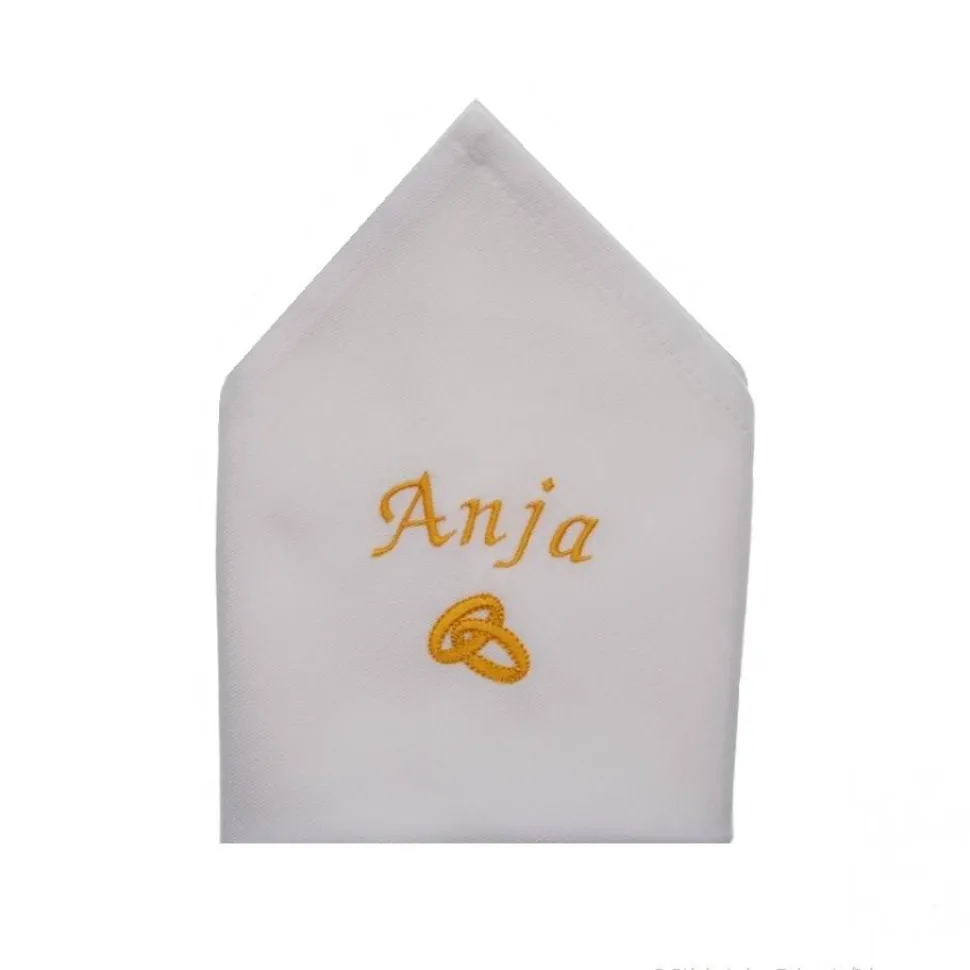 Sie wird mit dem Namen des Gastes bzw.des Brautpaares leicht gebogen bestickt und Ehering.