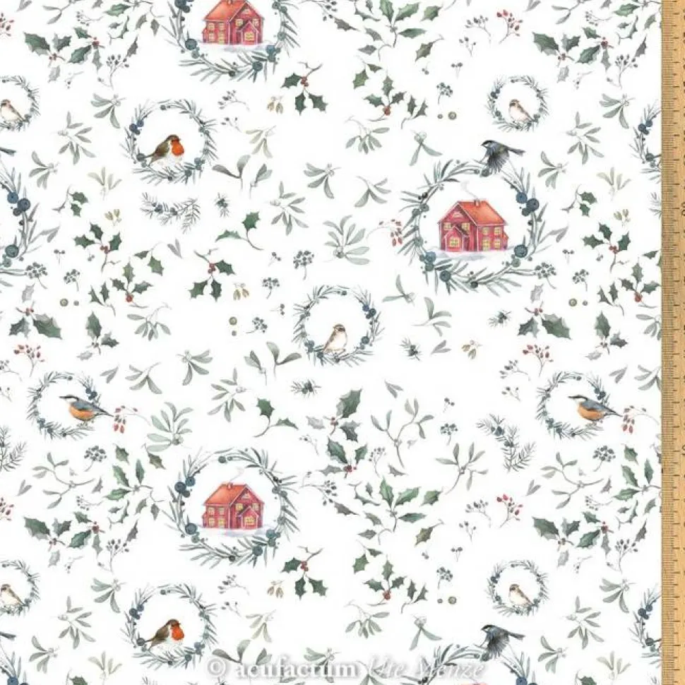 Zartes Wintergrün und feine Kränze bilden den Grund dieses schönen Stoffes. Rote Häuschen im Schnee und die lieben Wintervögel setzen feine Akzente. Dieser Baumwollstoff lässt Raum für viel Kreativität und lässt sich wunderbar in die unterschiedlichsten Arbeiten integrieren. Kissen, Decken, Täschchen, Accsessoires, Kinderkleider, Plaids natürlich auch textile Dekorationen rund ums Baby oder Kind. Der Phantasie sind keine Grenzen gesetzt.