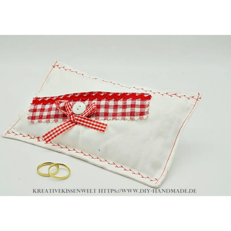 Entdecke ein einzigartiges bayerisches Ringkissen in Weiß mit roter Applikation – ideal als Ringträgerkissen zur Hochzeit und Vermählung. Dieses Unikat von KreativeKissenwelt ist handgemacht aus Franken und besticht durch seinen weißen Vintage-Baumwollstoff mit einer Applikation aus handgewebtem Bauernstoff in rot-weiß-kariert. Der Knopf und die Schleife ermöglichen eine sichere Befestigung der Ringe.