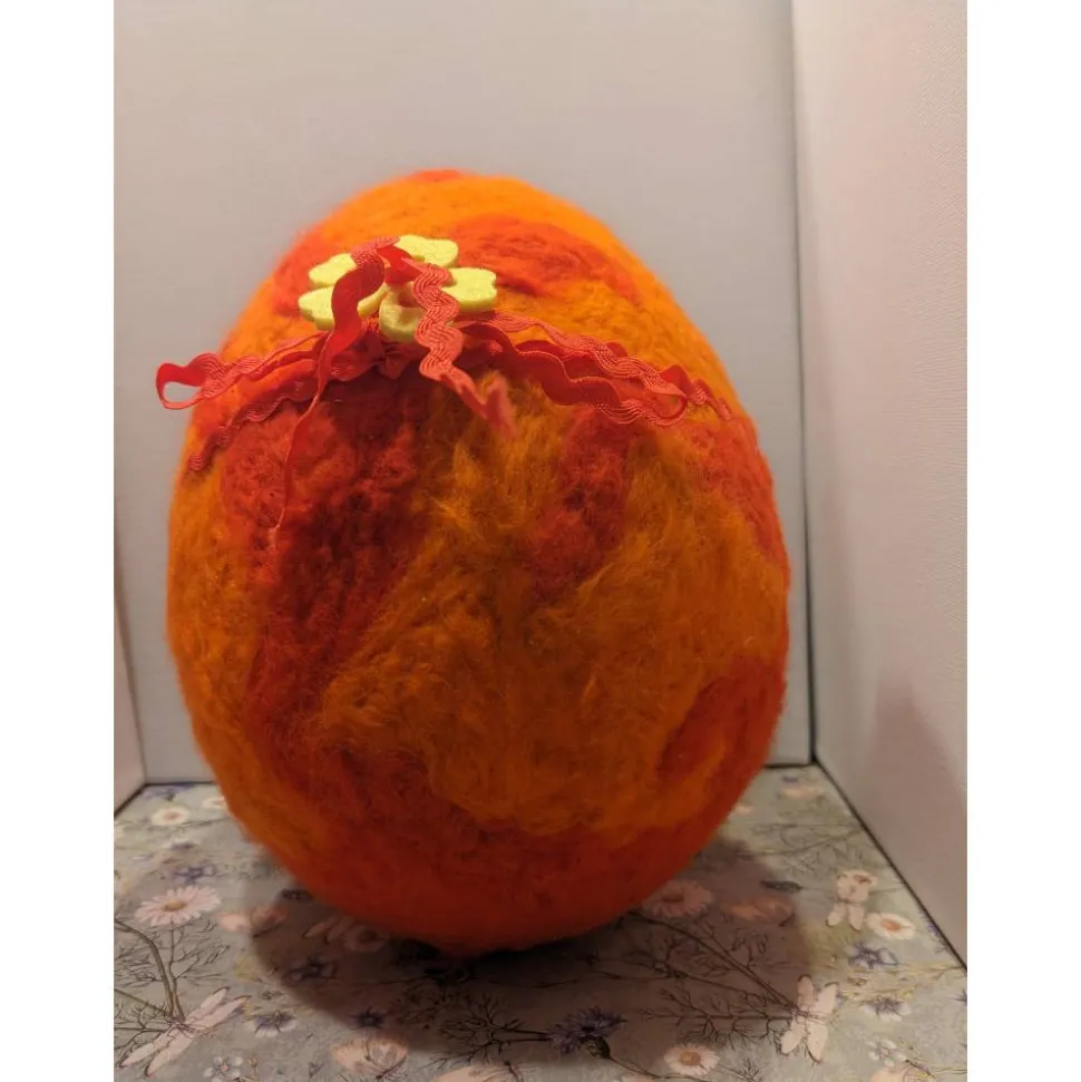 Dabei habe ich orangene – und rotfarbene Filzwolle mit einer Filznadel in das Styroporei eingearbeitet. Ostermotive und Zackenlitze vervollständigen die Verzierung.