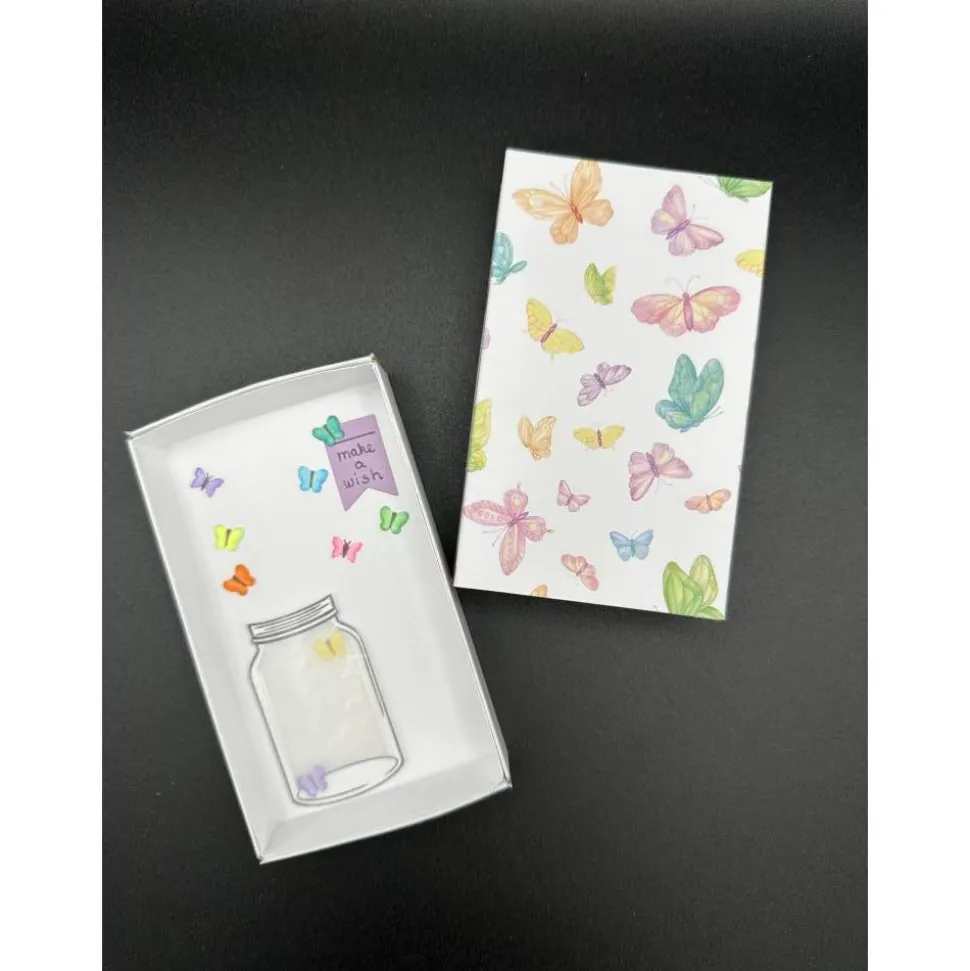 Die Innenschachtel ist mit hochwertigem weißem Tonpapier ausgekleidet. Auf dem Boden befindet sich ein dekoratives Glas aus Transparentpapier, in das du einen Geldschein einstecken kannst. Kleine, liebevoll gestanzte Schmetterlinge schmücken das Innenleben und machen jede Box zu einem Unikat.