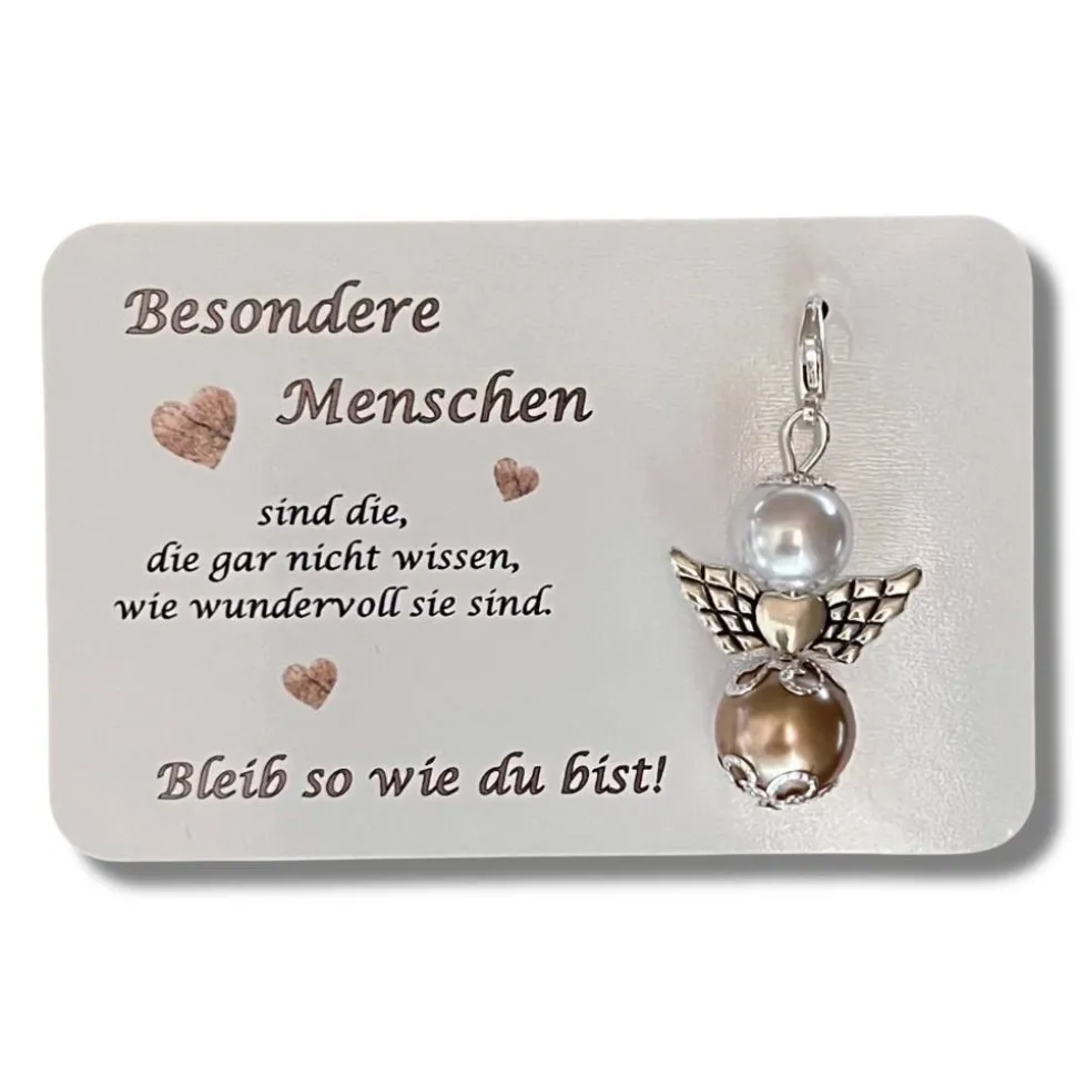 Ein Perlenengel hat mit Karabinerhaken eine Gesamtlänge von ca. 4,5 cm, Flügelfarbe silber.