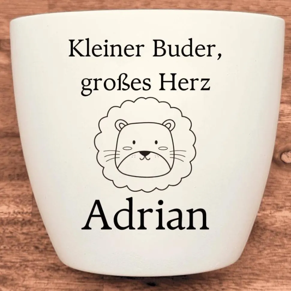 Verschenke zur Geburt eines kleinen Bruders einen personalisierten Blumentopf mit einem liebevoll gestalteten, niedlichen Motiv. Dieses besondere Geschenk wächst mit der Familie heran und symbolisiert das Leben, die Freude und die Verbundenheit innerhalb der Familie. Es schafft eine bleibende Erinnerung an den besonderen Moment und unterstreicht die einzigartigen Eigenschaften des kleinen Bruders: Liebe, Zusammenhalt und ein Leben voller gemeinsamer Abenteuer.